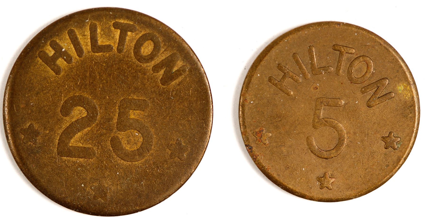1) Round brass 22mm HILTON / 5 // BLANK. 2) Round brass 25mm HILTON / 25 // BLANK. Related to Baron Hilton and his first or early hotel. HWAC# 62356 Date: Location: Houston, Texas
