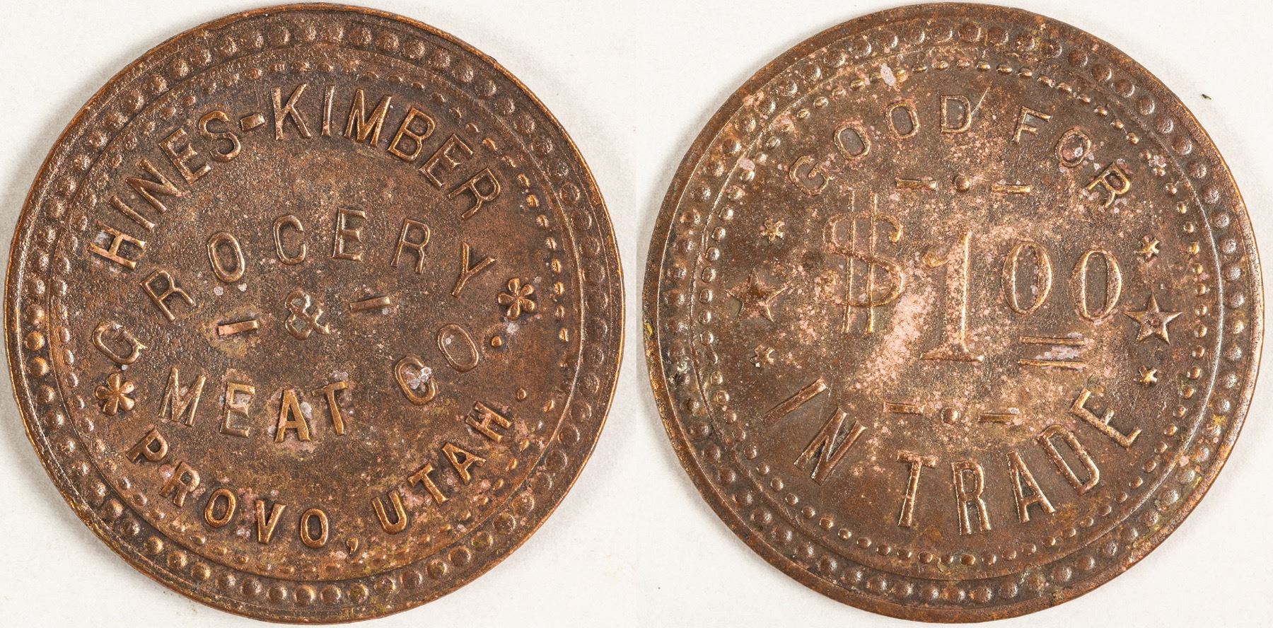 Obv.: Hines-Kimber / Grocery / & / Meat Co. / Provo, Utah; Rev.: Good For / $1.00 / In Trade. Br., rd., 28 mm. State: Utah City: Provo Date: ID# 76464