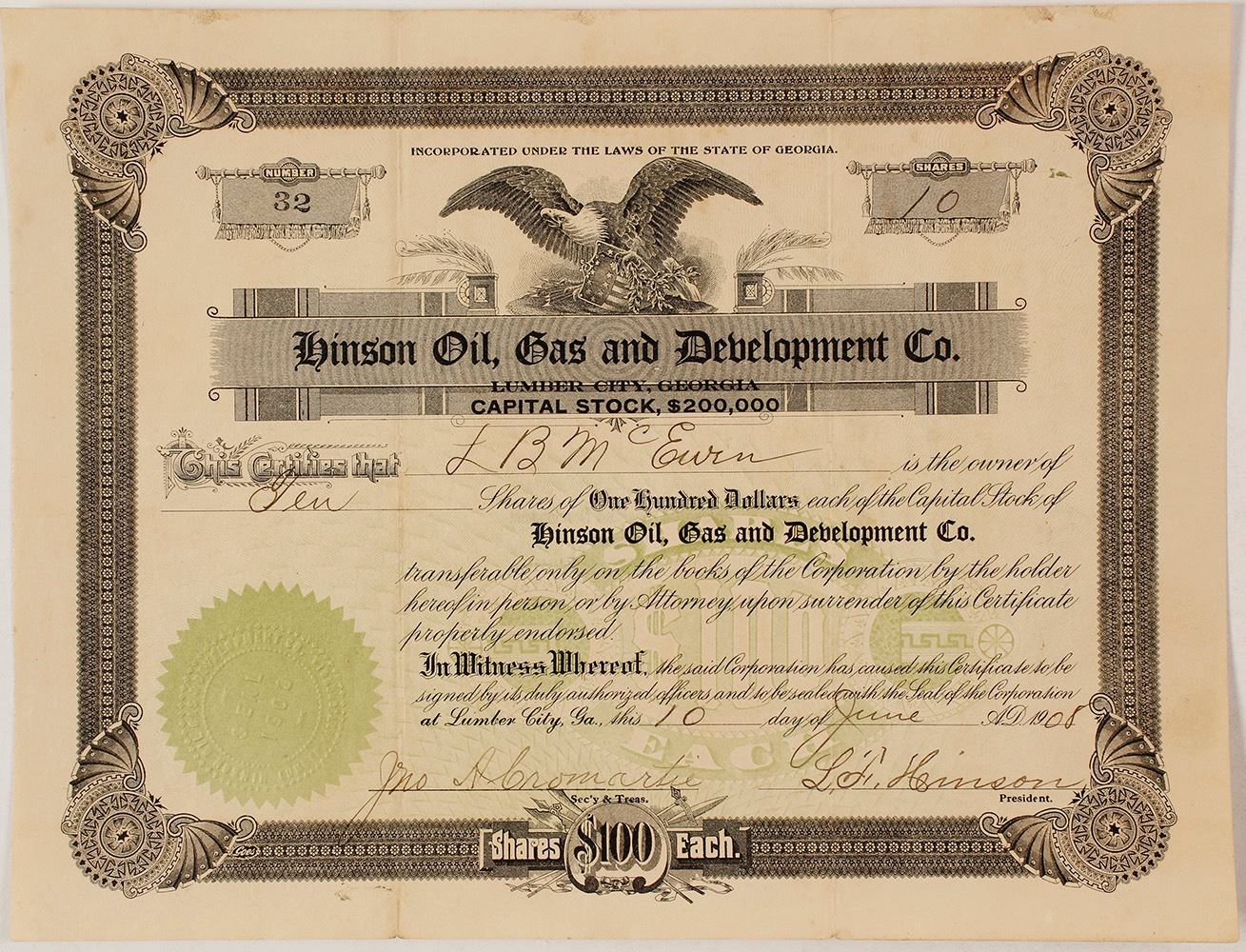 Rare Georgia Oil Stock Certificate. Number 32 for 10 shares in 1908 for LB McEwen. Signed by secretary / treasurer John A Cromartie and president Hinson. In 1908 a test was made near Hazelhurst by the Hinson Oil Gas and Development Co. This well is reported to have been sunk to about 985 feet and then shot with dynamite which bridged the hole and badly damaged the casing. A barrel or more of crude oil was reported taken from the well after the shot but it seems that the well was never cleaned out to continue the test. [National Petroleum News, Volume 14, Issues 9-17, page 73. This article is a 1922 history of oil in Georgia!] Two vertical folds with small tears at edges. Light, small smudge marks on upper right. Over all very nice! (Al Adams Gold Rush Memorabilia Collection) Date: 1908 Location: Hazelton, Georgia HWAC# 57321