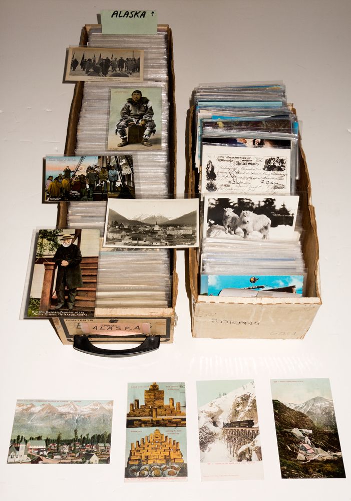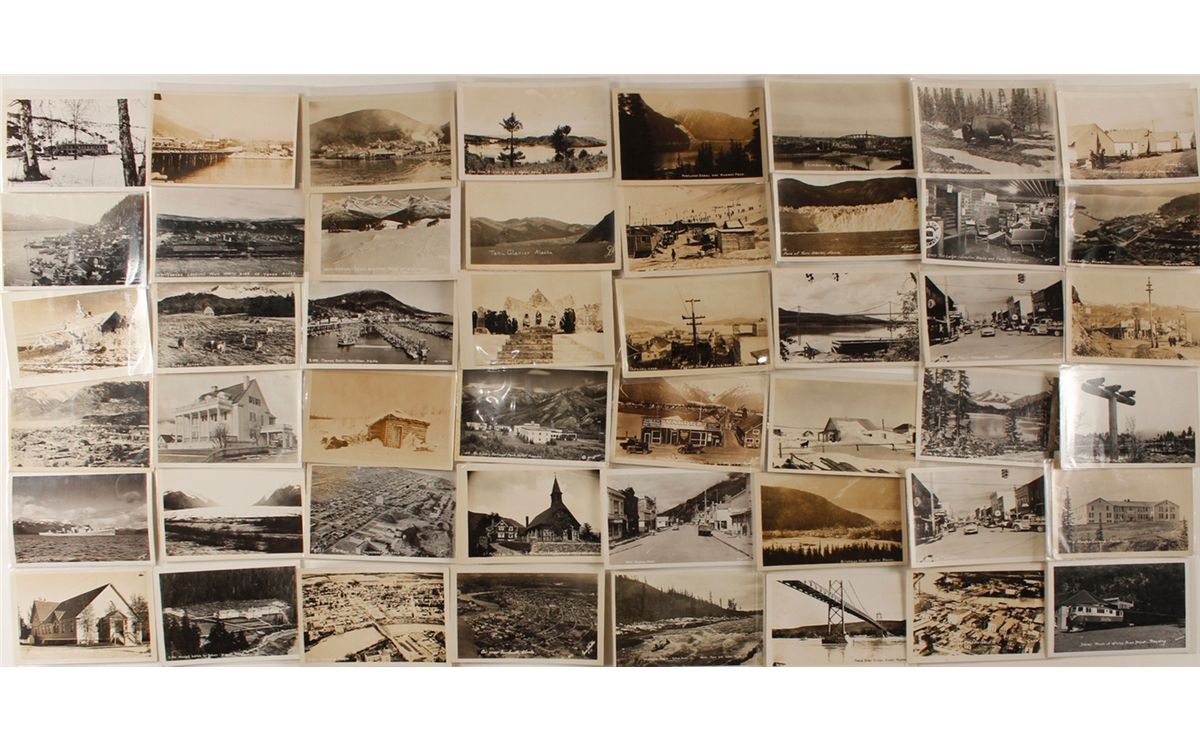 Once in a lifetime archive! Phenominal historic postcard collection (1916 cards, collected for over a 40-year period) of many Alaskan towns. Represented are: many street and city views, landscape views, "ship after a storm"—looks like ice sculpture, docks, railroads, mines, gold, totems, steamers, people, sled dogs, bears and other animals.