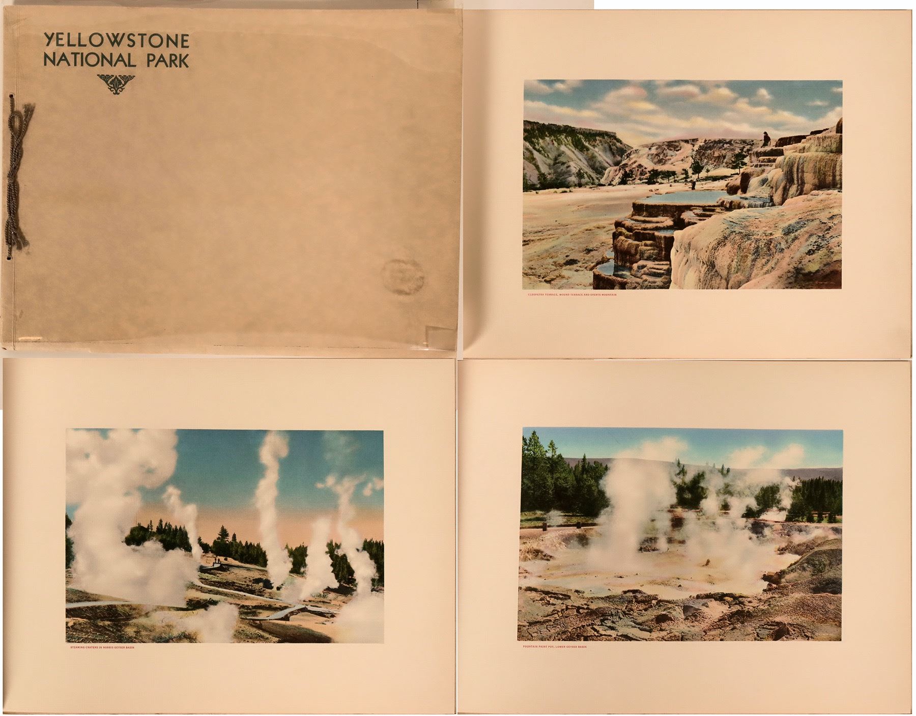 "Yellowstone National Park," book contains 24 pages, each with a print of a hand-colored photo, copyrighted by Haynes, Inc., c1920's-1930's. The book measures 13.5 x 10.5 inches, with each photograph on heavy cardstock, and each page frameable in its own right. Photographer F. Jay Haynes built stores on land leased in Mammoth Hot Springs in 1884 and at Old Faithful in 1897. After he retired, his son Jack took over the business, and in 1927 built stores, called photo or picture shops, in the Mammoth and Fishing Bridge campgrounds, and a larger facility near what was then the Old Faithful Auto Camp. Eventually, 13 Haynes stores were opened in hotels or their own buildings. The Haynes’ photography promoted both tourism in the West and the idea of a national park.