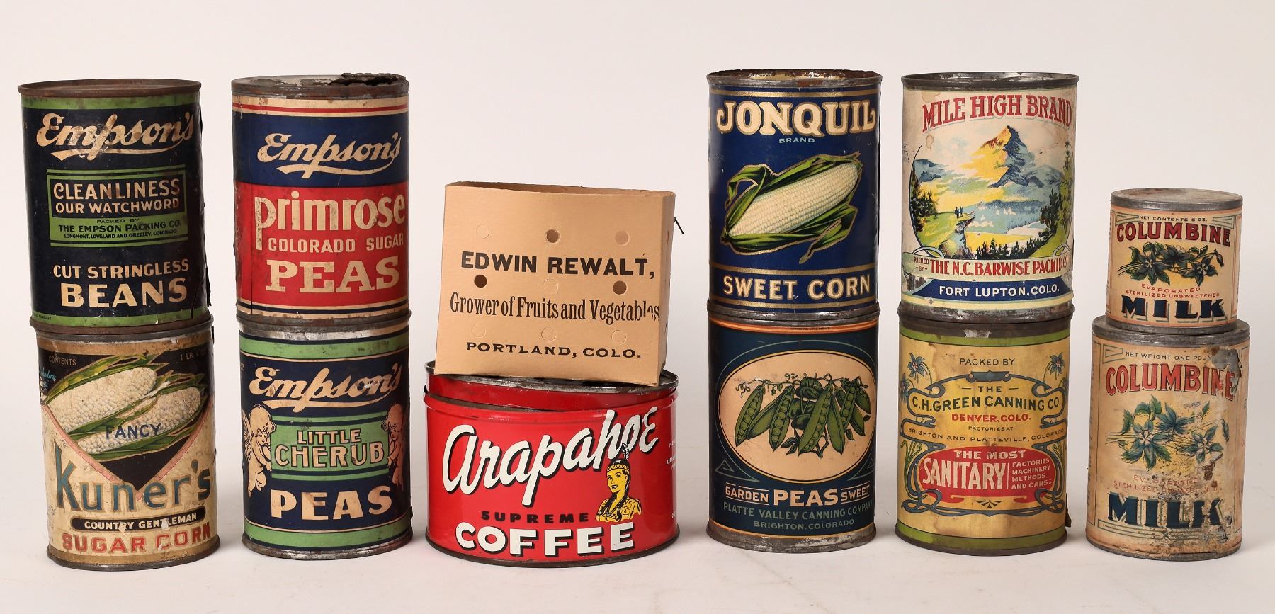 11 historic Colorado tins. 3x Longmont, 3x Brighton, 1 Grand Jct., 3x Ft. Lipton, 1x Pueblo. Up to 4.5" tall. Colorado Gary Bracken Collection
