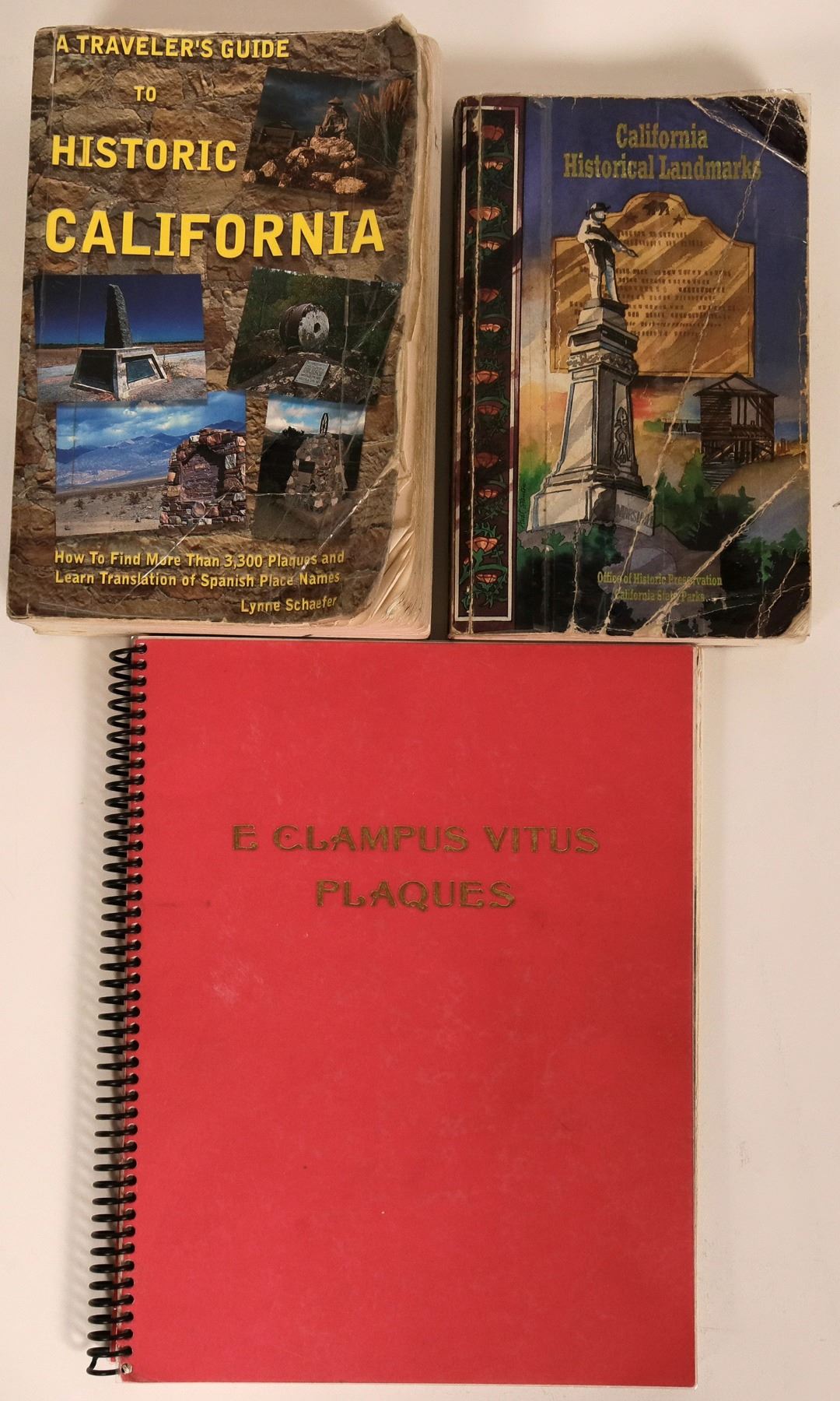 This is a collection of books highlighting California's colorful history; California Historical Markers printed by the Office of Historical Preservation California State Parks, A Traveler's Guide to Historic California by Lynne Schaefer, and E Clampus Vitus Plaques 1930-1995 by Castro and Fabrini. All are used books.