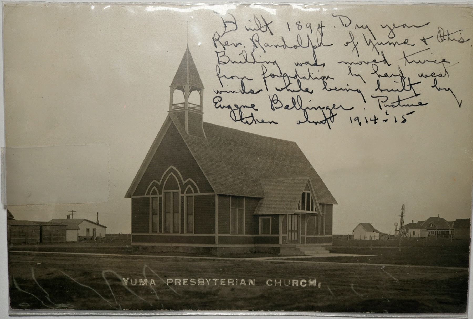 The Yuma Presbyterian Church was built in 1894. Reverend Randolph of Yuma and Otis Building was moved twice from foundation by hard west while being built by Eugene Bellinger. This photo was taken about 1914-1915. /