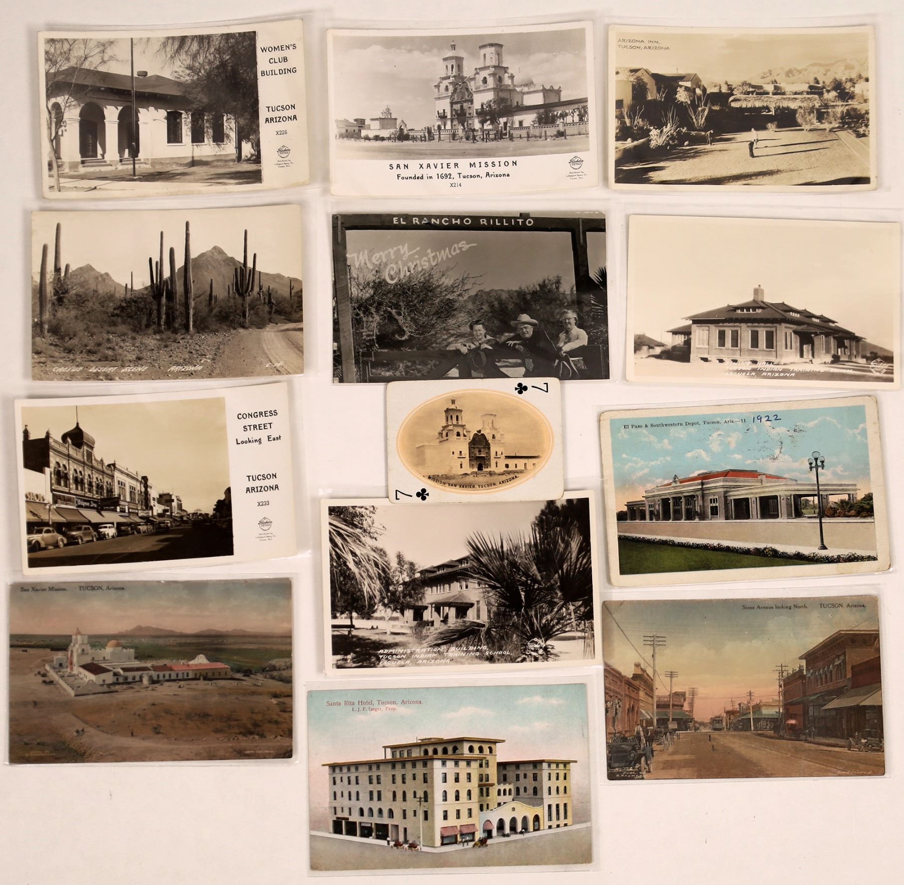 Actually 12 postcards (8 B&W, 4 chromoliths) of famous scenes of Tucson, Arizona. Some buildings are long gone, but some, like the San Xavier Mission, the Arizona Inn, and the Railroad depot (until recently a restaurant) exist today. Last item is a 7-of-clubs playing card with an image of Mission San Xavier.