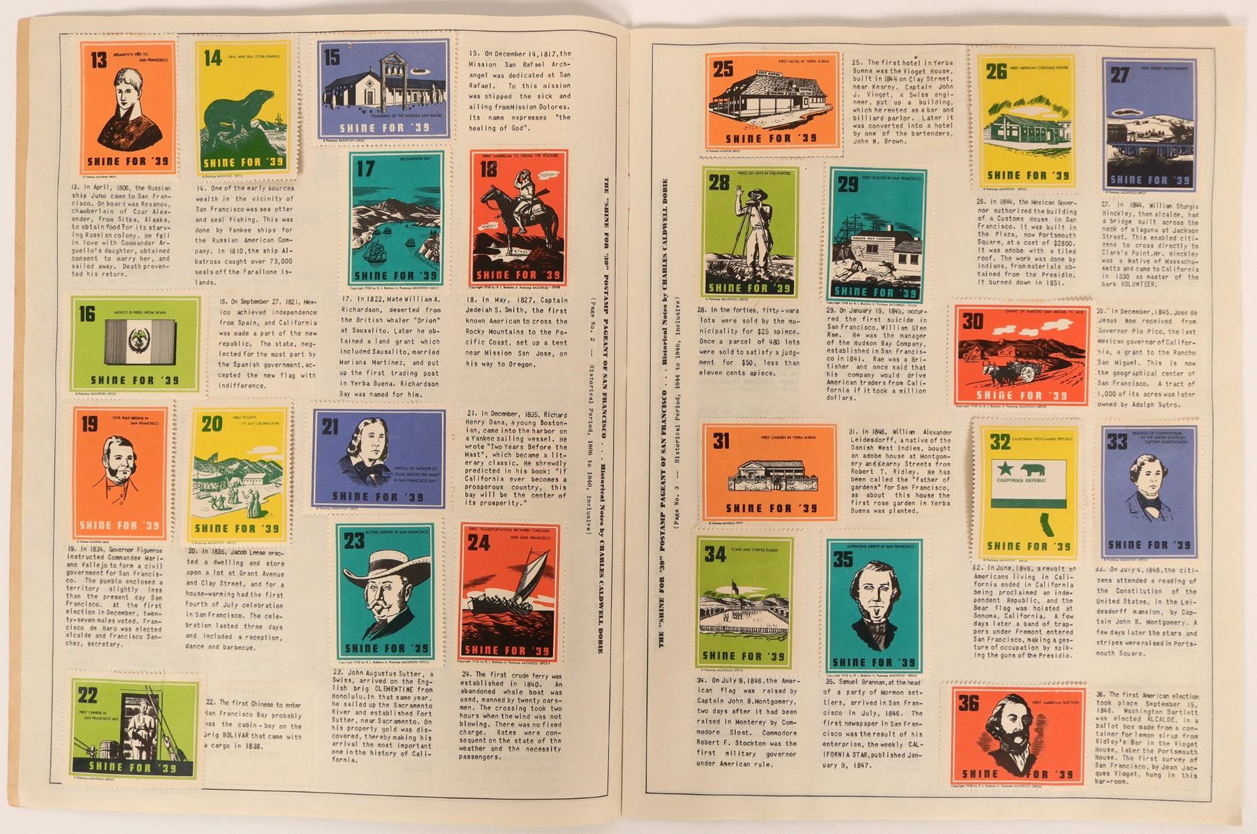 Lot contains two collections of special California/San Francisco area stamps, with 162 in a booklet, Shine for '39; and 26 commemorating California landmarks, copyright 1914, Volland Poster Stamp Co., Chicago. California stamps are 1-1/2 x 2 inch with colorful prints depicting famous places, such as the Greek Theatre in Berkley, Lake Merritt in Oakland, Stanford University in Palo Alto, 12 of the California missions, and more. The Shine for '39 booklet, copyright 1938 by R. L. Robbins, Jr., titled, "The Postamp Pageant of San Francisco," asked customers to visit merchant sponsors and pick up stamps to fill the book. Most of this book has been filled.