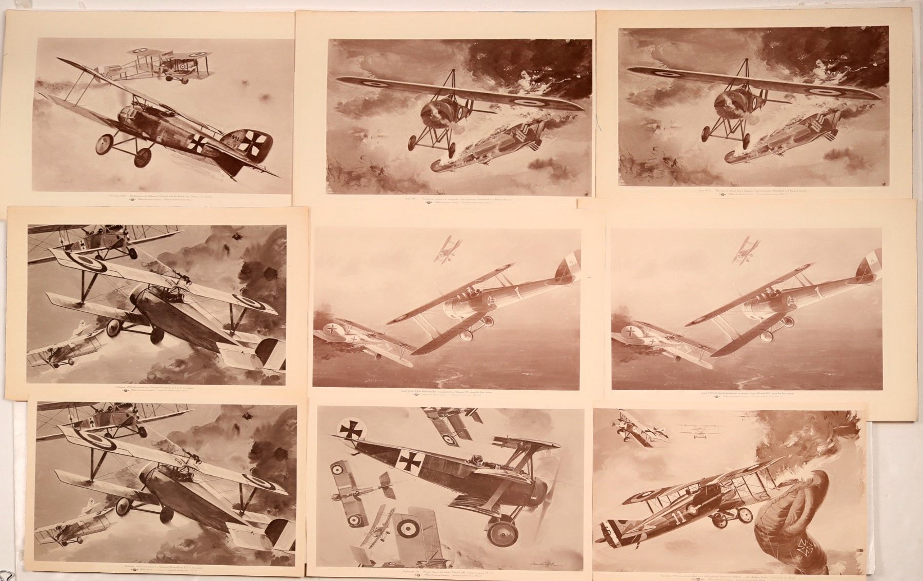 Sepia prints from the Philips Petroleum Historical Aircraft series. In the 1960's, these art prints of WWI and civilian airplanes were handed out at Phillips Petroleum gas stations along Route 66 as advertising premiums. In this collection are Twenty Seven i.e:First Air Victory Over the Zeppelin, Avro 504" bomb Zeppelin factory, Belgian Ace Willy Cooper in Harlot HD-1, Richthofen in his Albatross duels British Ace Major Hawker and more. Each has some historical information on the reverse of each. Unmounted and each is very good condition.27 total