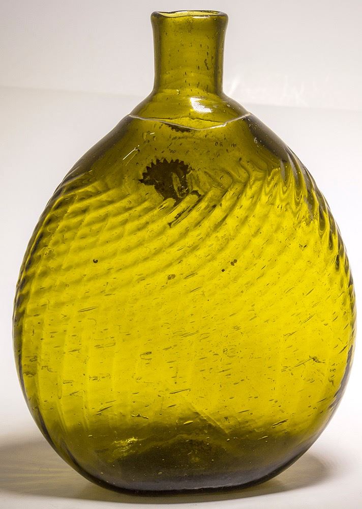 Pitkin Swirl, dip mold, Open pontil pint, curved crosshatch design, yellow-green. 6.5" x 5". No visible chips or cracks. Date: Location: HWAC # 54106