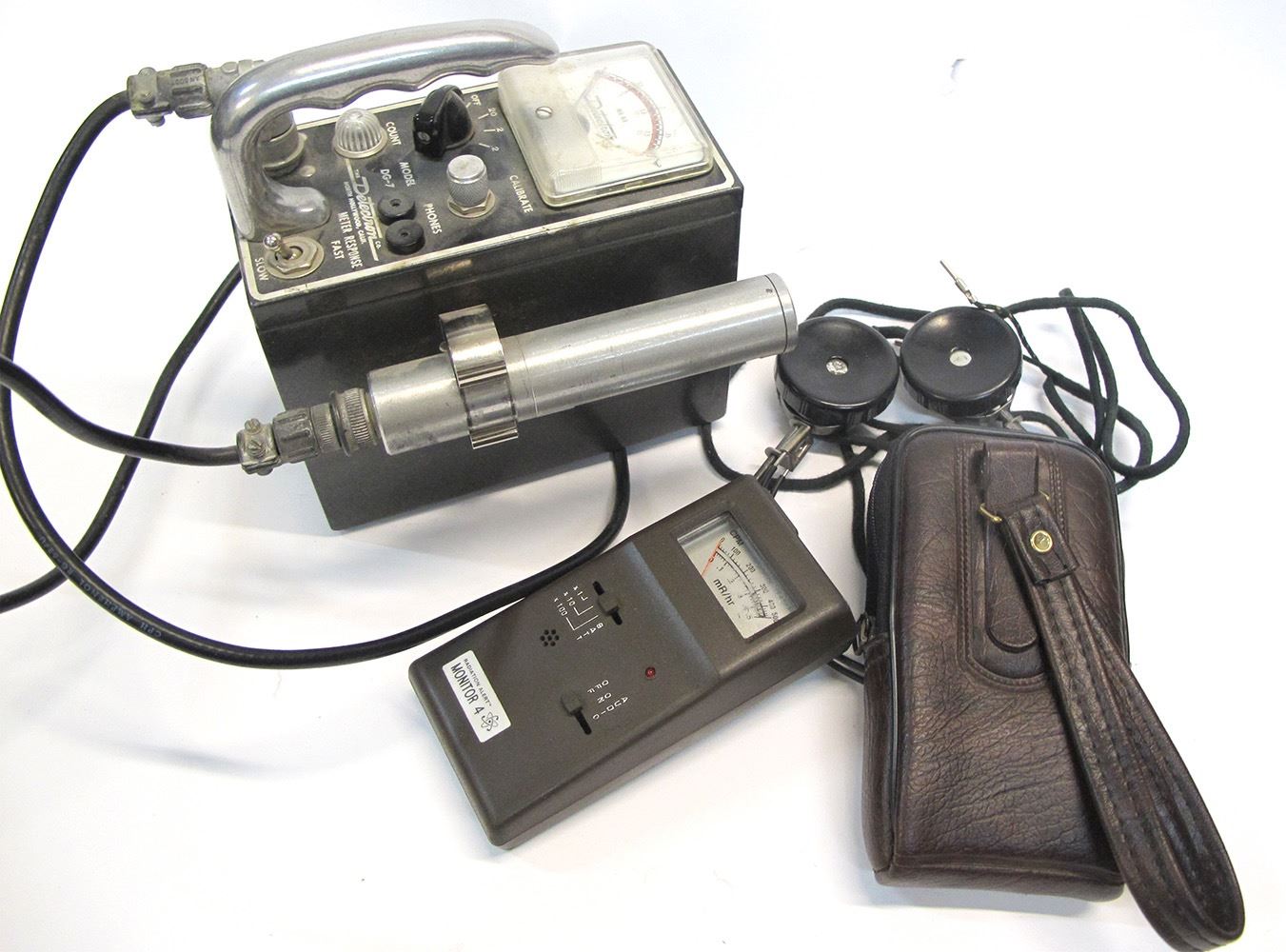 Geiger counter with nickel plated carry handle, rad meter, detecting wand with wired cable, headphones, made by Detectron, North Hollywood, CA. c. 1950's. 7.5" x 3.5" x 6.5". Monitor 4 Radiation Alert by S.E. International. Brown plastic, battery operated Cesium detector with simulated leather carry case. 1.5" x 2.5" 5.75". Date: Location: HWAC # 53754