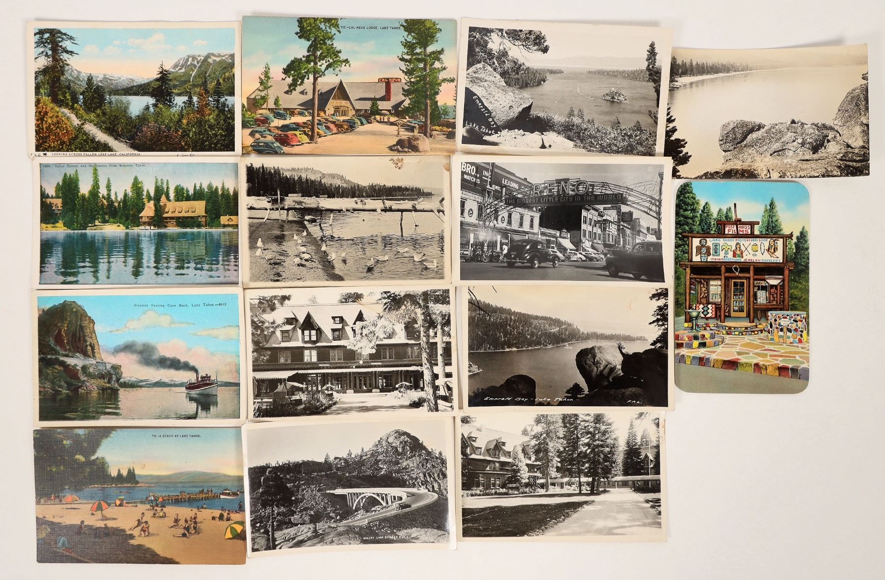 Collection of 14 postcards of scenes from the Lake Tahoe area, California, c1930s-40s. Includes 8 RPCs. Views include Emerald Bay, Reno, Donner Lake Bridge, Hunters Lodge, Cal-Neva Lodge, Cave Rock, Tahoe Tavern, Fallen Leaf Lake, etc. All unused.