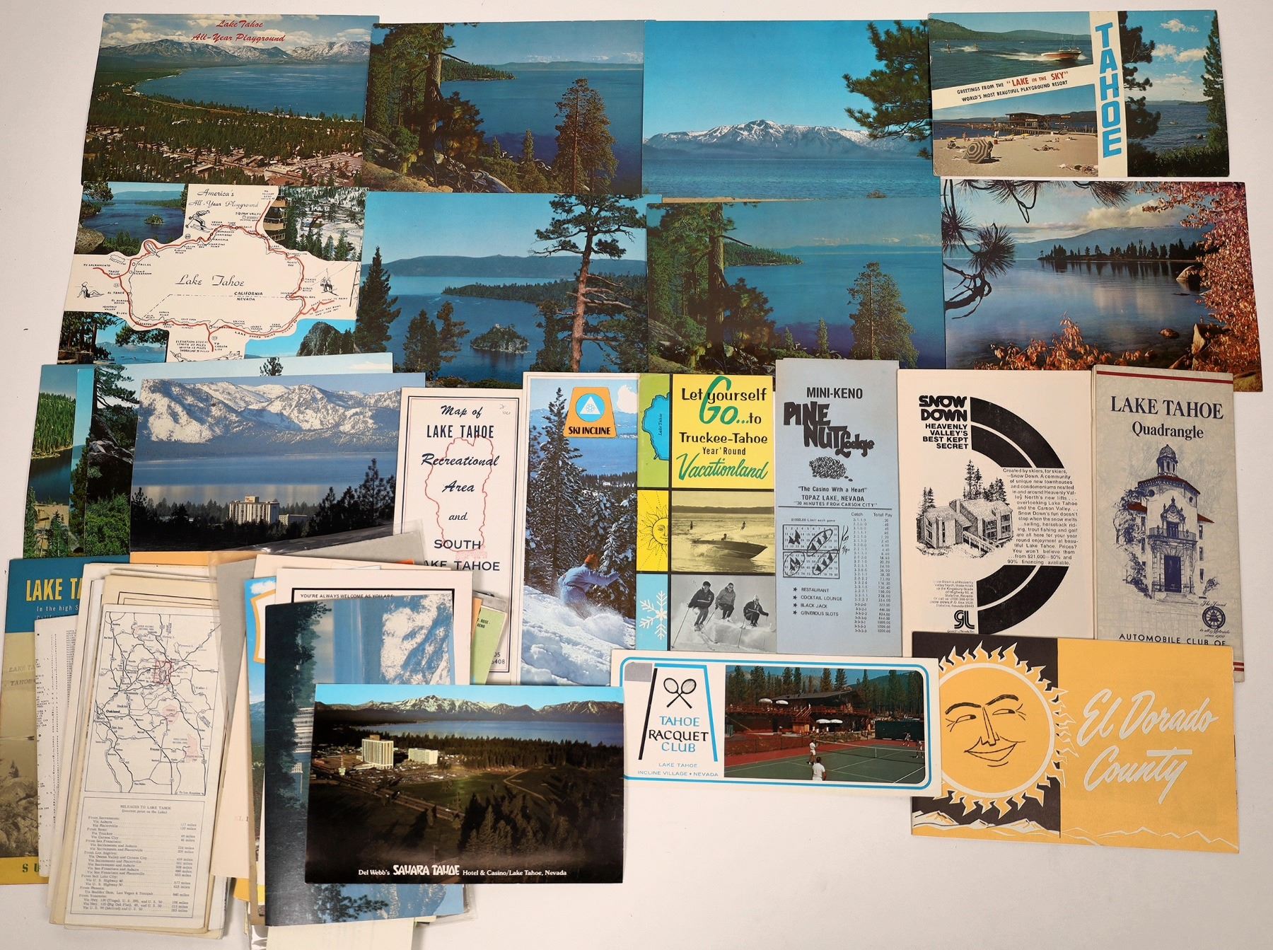 Over 50 maps, brochures, jumbo postcards and photographs of Lake Tahoe. B&W real photo postcard of Georges Gateway Club.
