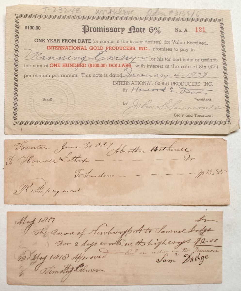 1819 check for two days work on a highway for the town of Newburyport. Samuel Dodge pulled in $2.00 for this one. Signed by Timothy Palmer. Palmer was a U.S. pioneer builder of covered timber truss bridges. A millwright, he was also a self-taught carpenter and architect, and in 1792 he built the Essex-Merrimack Bridge over the Merrimack River near Newburyport. Composed of two trussed arches meeting at an island in the river, the bridge remained in use for more than a century and was the prototype of the numerous bridges he later built throughout New England. Palmer’s most noted work was the completely enclosed Permanent Bridge (c. 1806) over the Schuylkill River at Philadelphia. In use until destroyed by fire in 1875, the Permanent Bridge proved the value of, and set the style for, covered bridges in the United States. I guess we know what Dodge was working on! Also an 1829 check from Taunton. (Ames Collection) City: Newburyport State: Massachusetts Date: hwac# 3839
