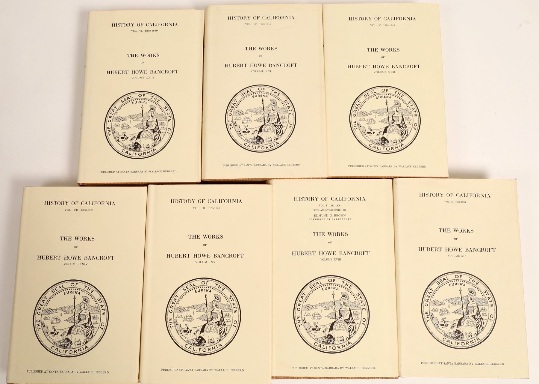 This is a collection series of the "History of California" published by Wallace Hebberd copyrighted in 1963 as a reproduction of historian Hubert Howe Bancroft. This is a seven volume set covering 1542 to 1890. Beautifully bound fabric, the Great Seal of the State of California, and with all dust jackets. In excellent condition.