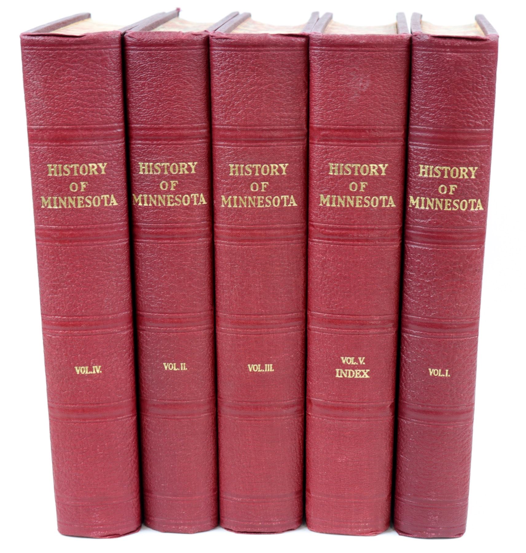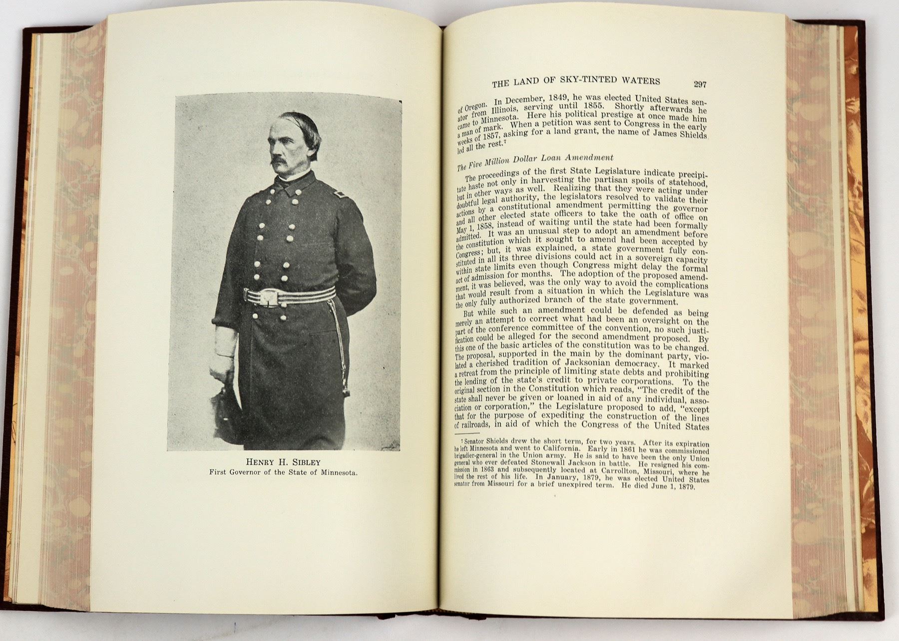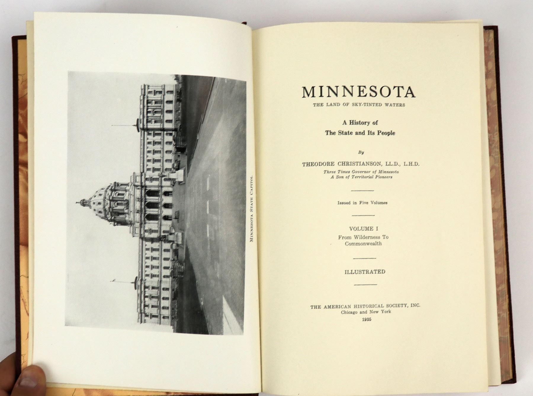 Minnesota: The Land of Sky-Tinted Waters. A History of the State and Its People. Written by Theodore Christianson and published by the American Historical Society, Inc. in 1935. Volumes I-V. Includes pictures and illustrations of important people and places in Minnesota history. 10.5 x 7, varied in length between approx. 530 and 670 pages, very good condition.