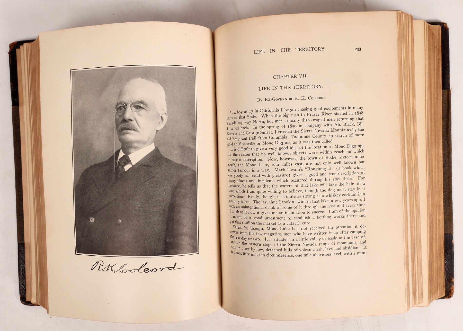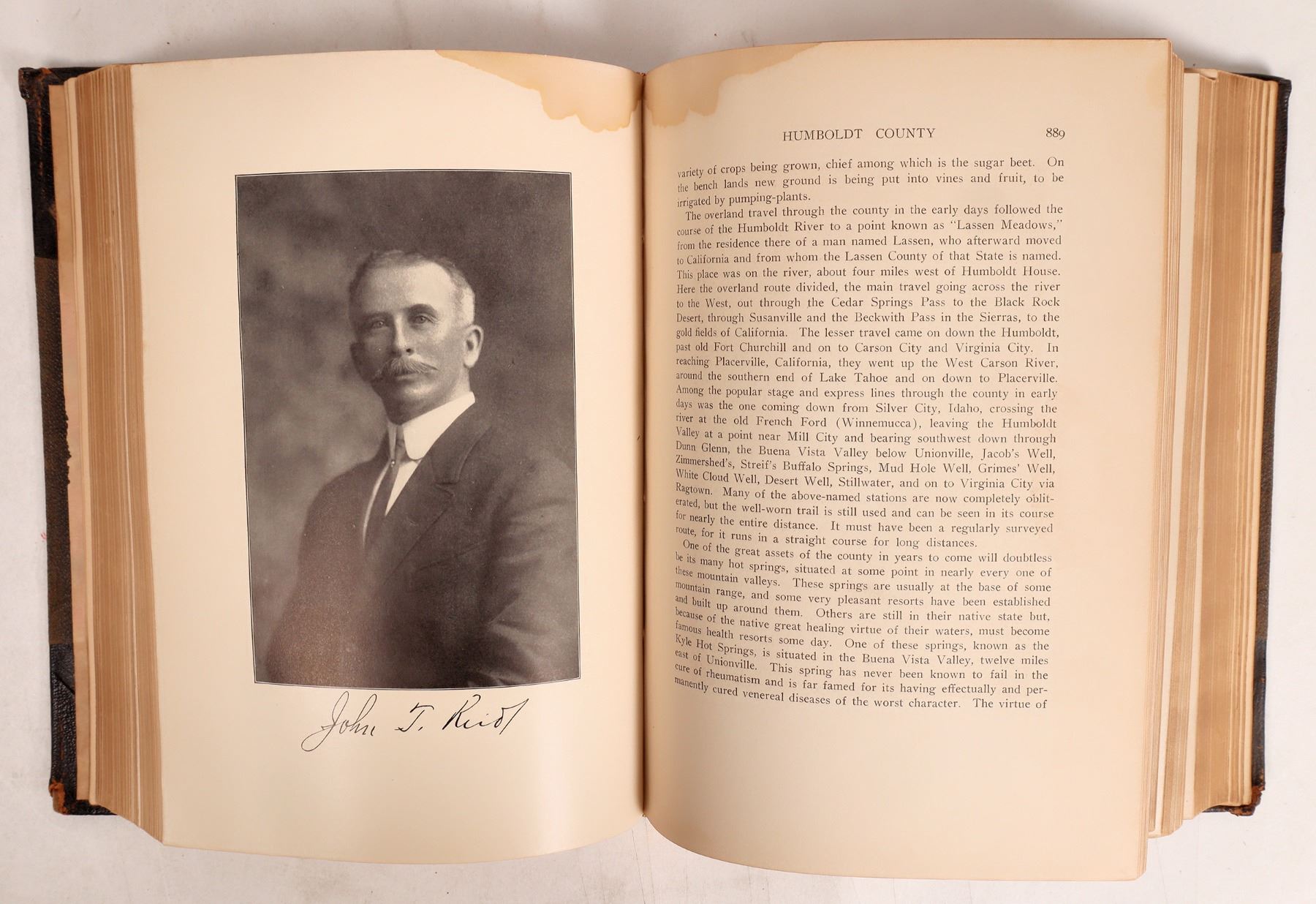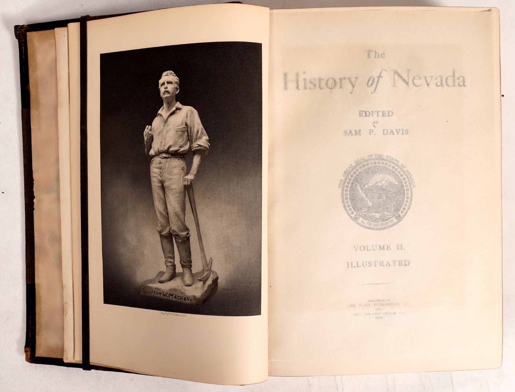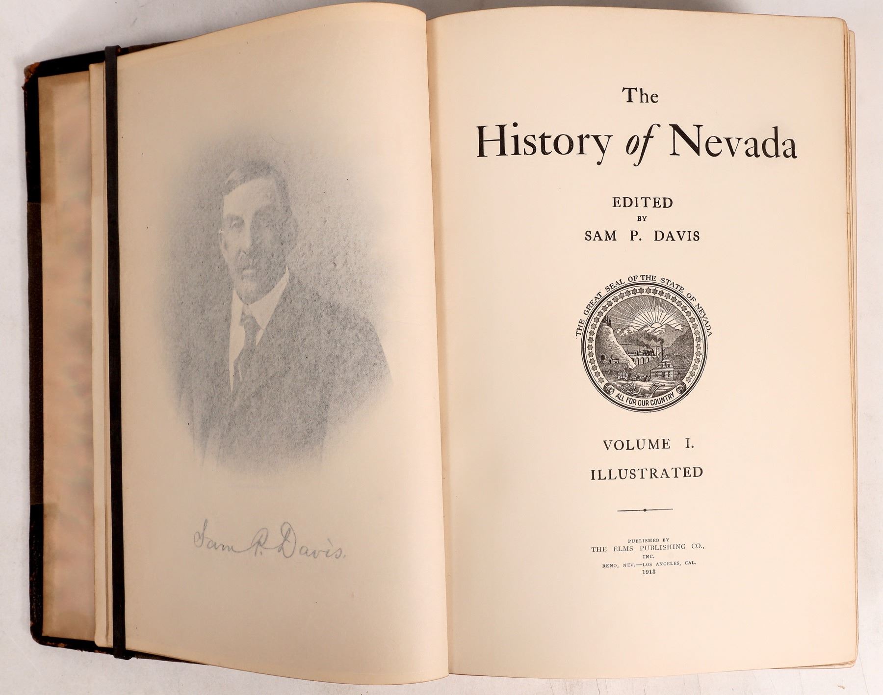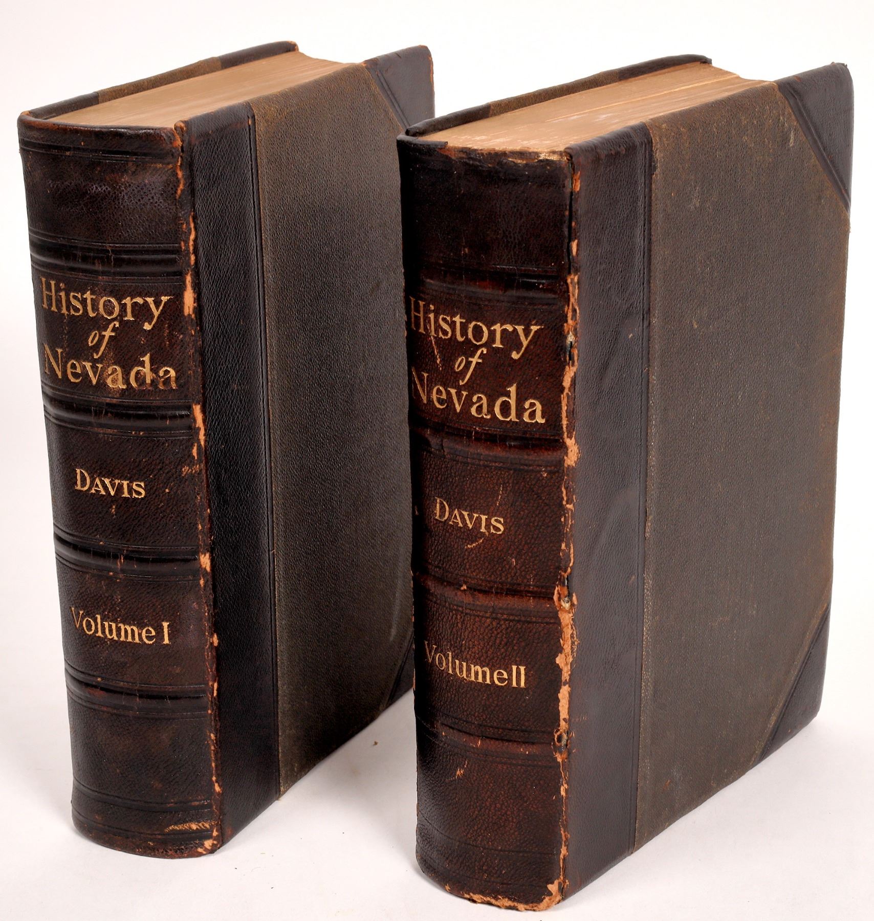 The Elms Publishing Co., 1913. 1st ed. 2 Vols. 646; 647- total 1279, xxiii pp. Portraits, plates. Orig. 3/4 black morocco, raised spine bands, marbled endpapers, gilt pages. Near fine. Several of the subject chapters are reliable renditions and have been used as primary sources for other books. Large section discussed biographies of important men of Nevada. Many lithos of same with tissues intact. A landmark study in Nevada history. Adams, Six-Guns, 568 "Has a chapter on lawlessness and such bad men as Jack Davis, Sam Langford, and Farmer Peel." Rampaging Herd, 658. Paher, Nevada, 450: "Of the half dozen major statewide histories published, this set is considered to be the rarest of all, even surpassing a first edition of Myron Angel's 'Thompson & West'. Likely less than 300 sets were published, only a few dozen of which remain in private hands. Editor Davis has brought together a huge collection of historical essays and special treatises written by about 45 people, though much of it is his own work". Rare, perhaps a few dozen exist in private hands of a run of about 300. Some wear to spine and cover.