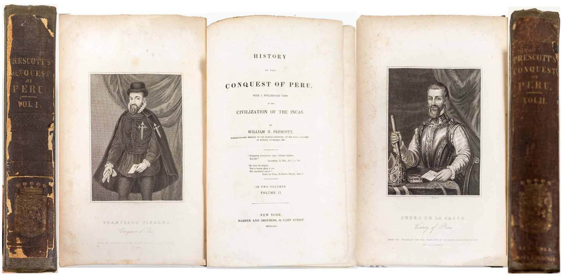 Early history of Spain's acquisition of Peru in volumes I and II of William H. Prescott's "History of The Conquest of Peru" Published by Harper and Brothers, 82 Cliff Street, New York, 1847. Cover wear, foxing throughout overall good condition for time period. Date: 1847 Location: zPeru HWAC# 40434