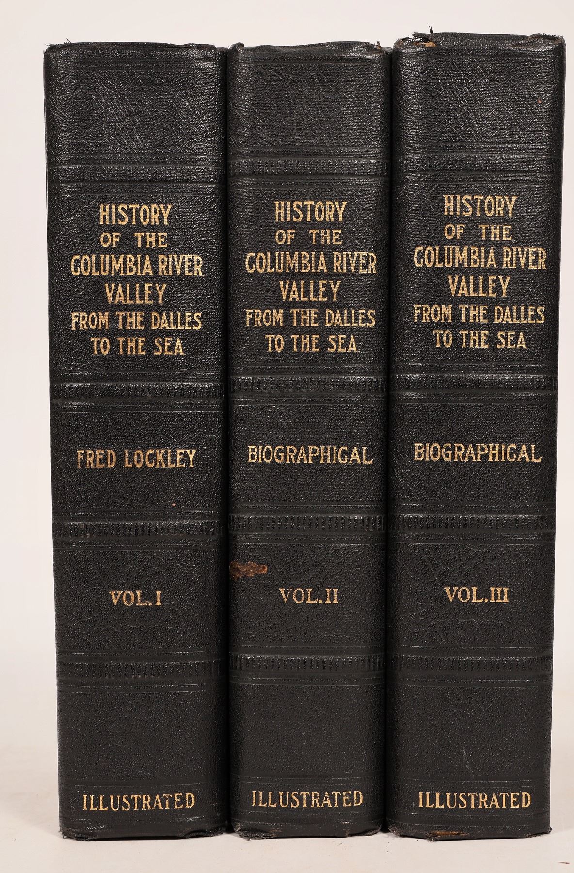"History of the Columbia River Valley from the Dalles to the Sea." Fred Lockley. First edition, 1928. Three illustrated volumes, each 10.5" x 7.5", with minor wear on spines and corners, otherwise very good. Includes: Vol. I, 1105 pp.; Vol. II, 994 pp.; and Vol. III, 941 pp. Lockley was a journalist best known for his editorial column published in the Oregon Journal, "Impressions and Observations of a Journal Man." Lockley authored many books which, like his editorials, were largely about his travels and interviews with early settlers in the Willamette Valley. It was said that he interviewed "bullwhackers, muleskinners, pioneers, prospectors, 49ers, Indian fighters, trappers, ex-barkeepers, authors, preachers, poets and near-poets."