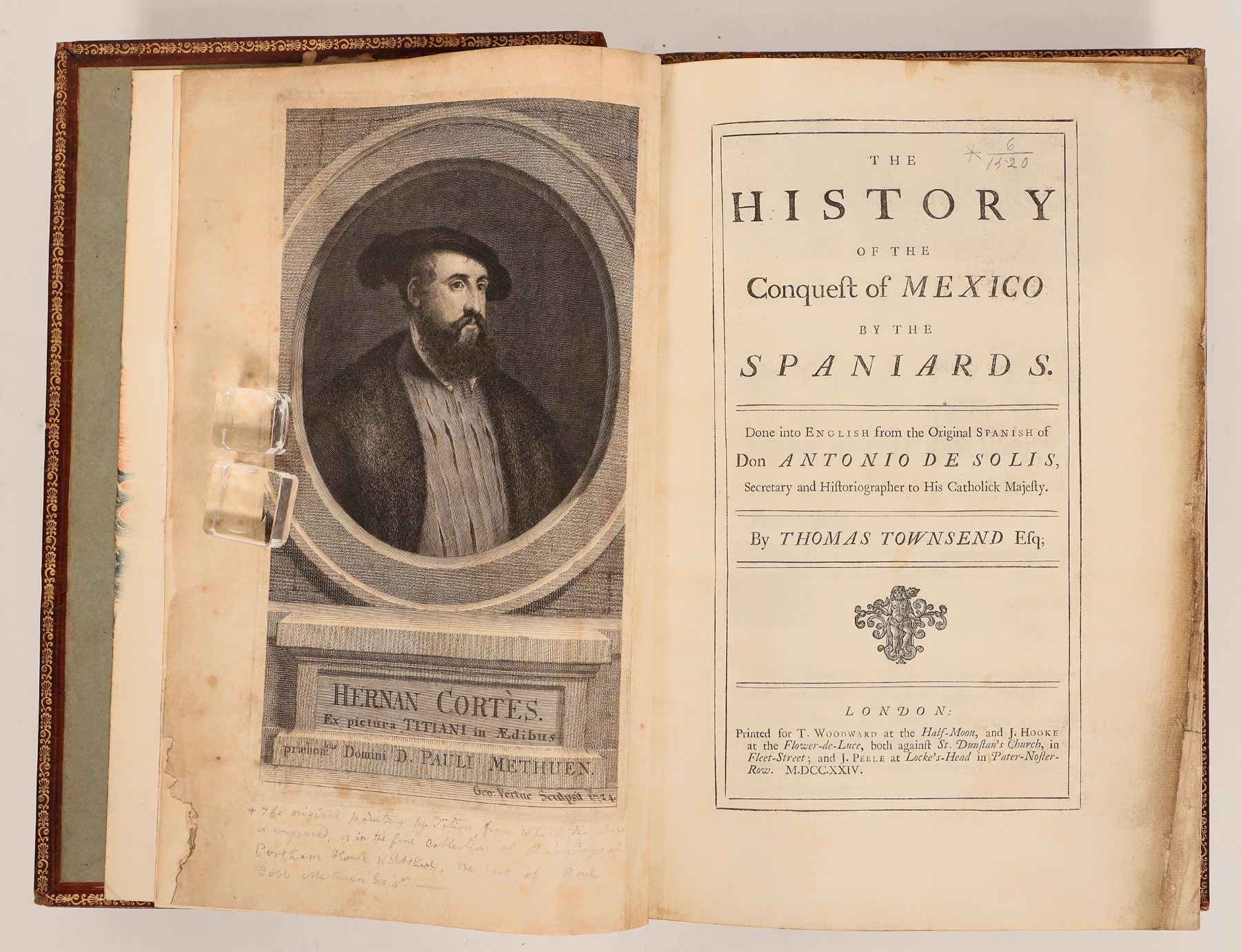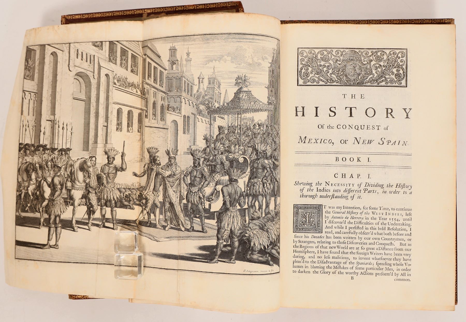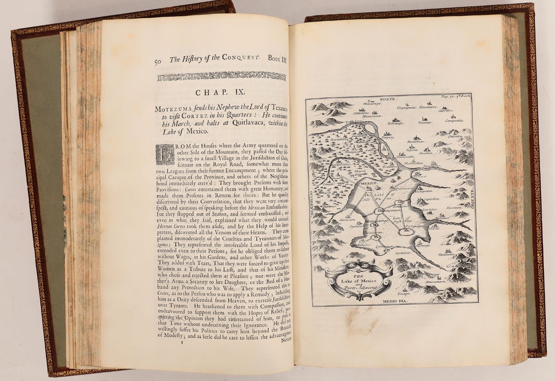 1724 printing in English from the original Spanish of Antonio de Solis, 1684 in Madrid. The Spanish conquest of Mexico or New Spain and the first edition in English. 152pp, foldout maps and engravings. Last page has lower crease, foxing, both boards detached and present, lower spine missing about 3". Please inspect, sold as is.