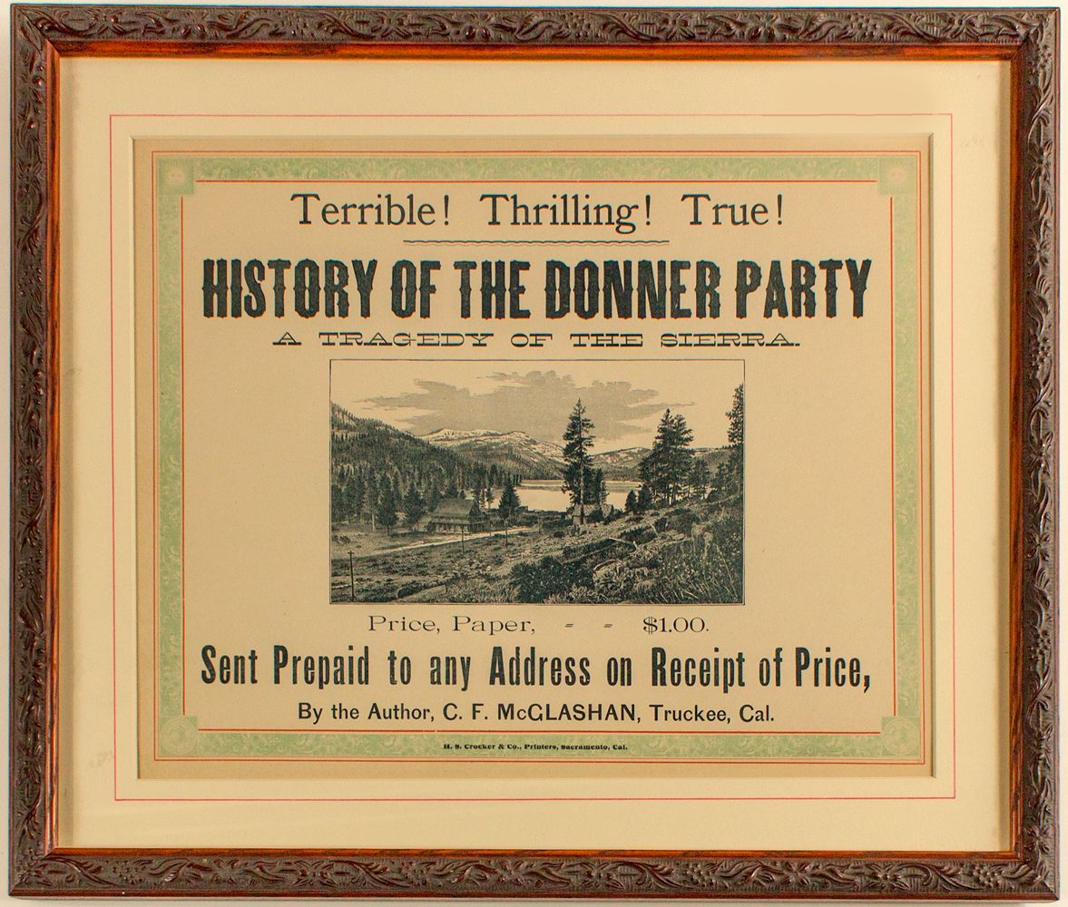 "Terrible! Thrilling! True!" This nicely framed small poster advertises the first book about the history of the Donner Party (published 1879 by H. S. Crocker & Co.,Printers, Sacramento, Cal.) by C. F. McGlashan of Truckee, CA. It features lovely illustration of the site of the tragedy.
