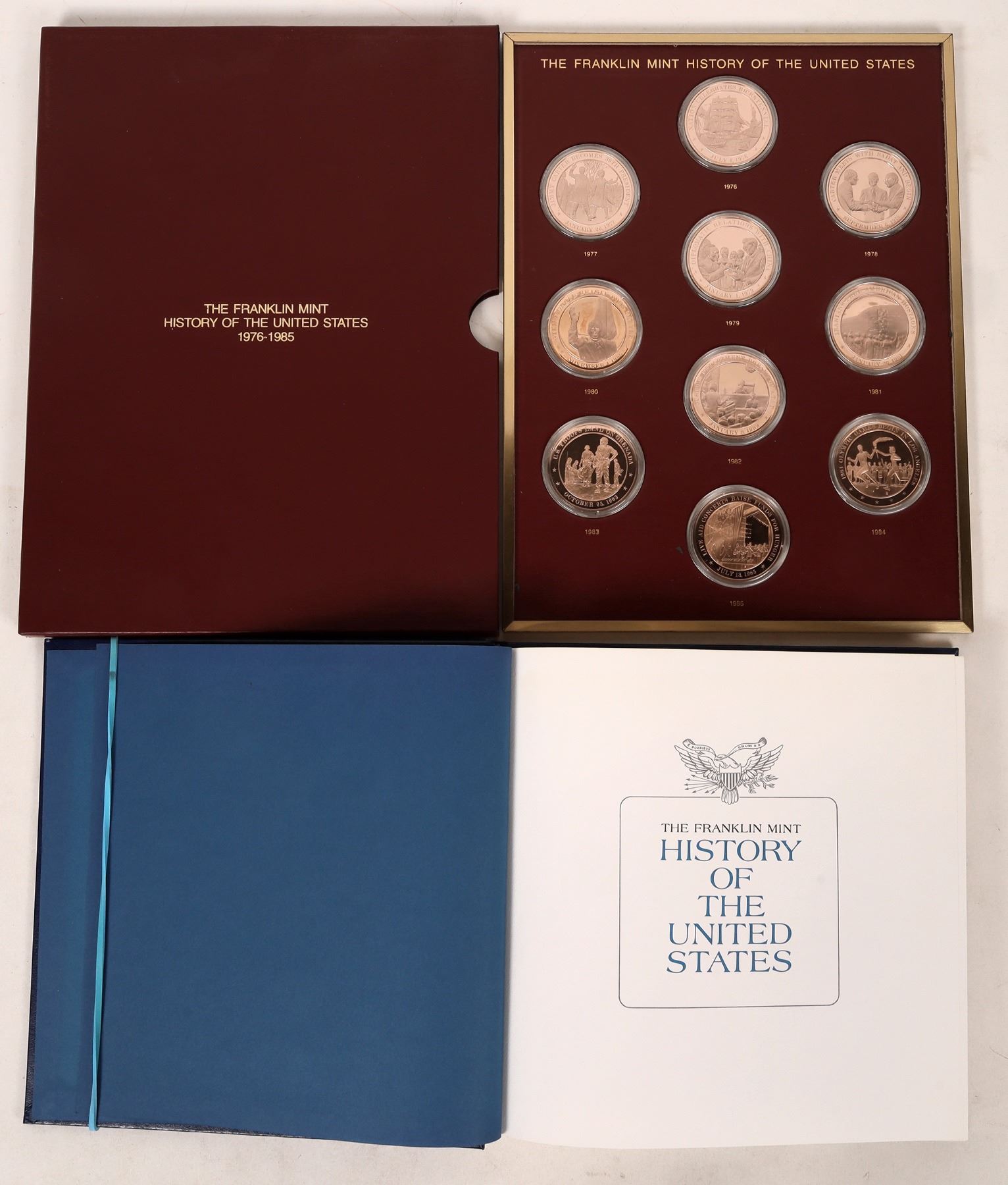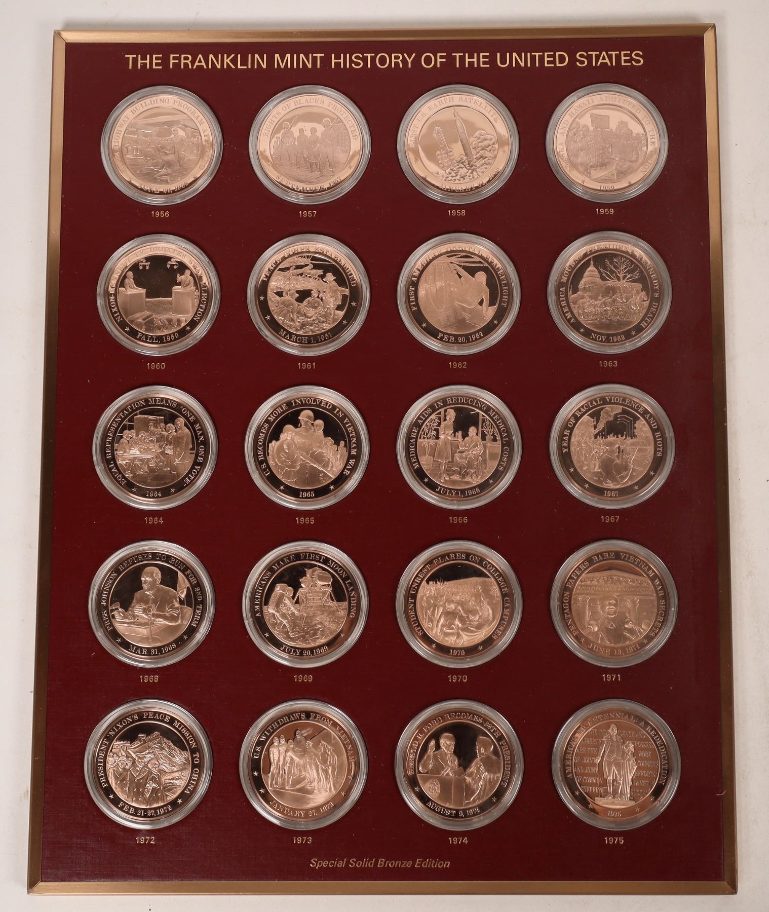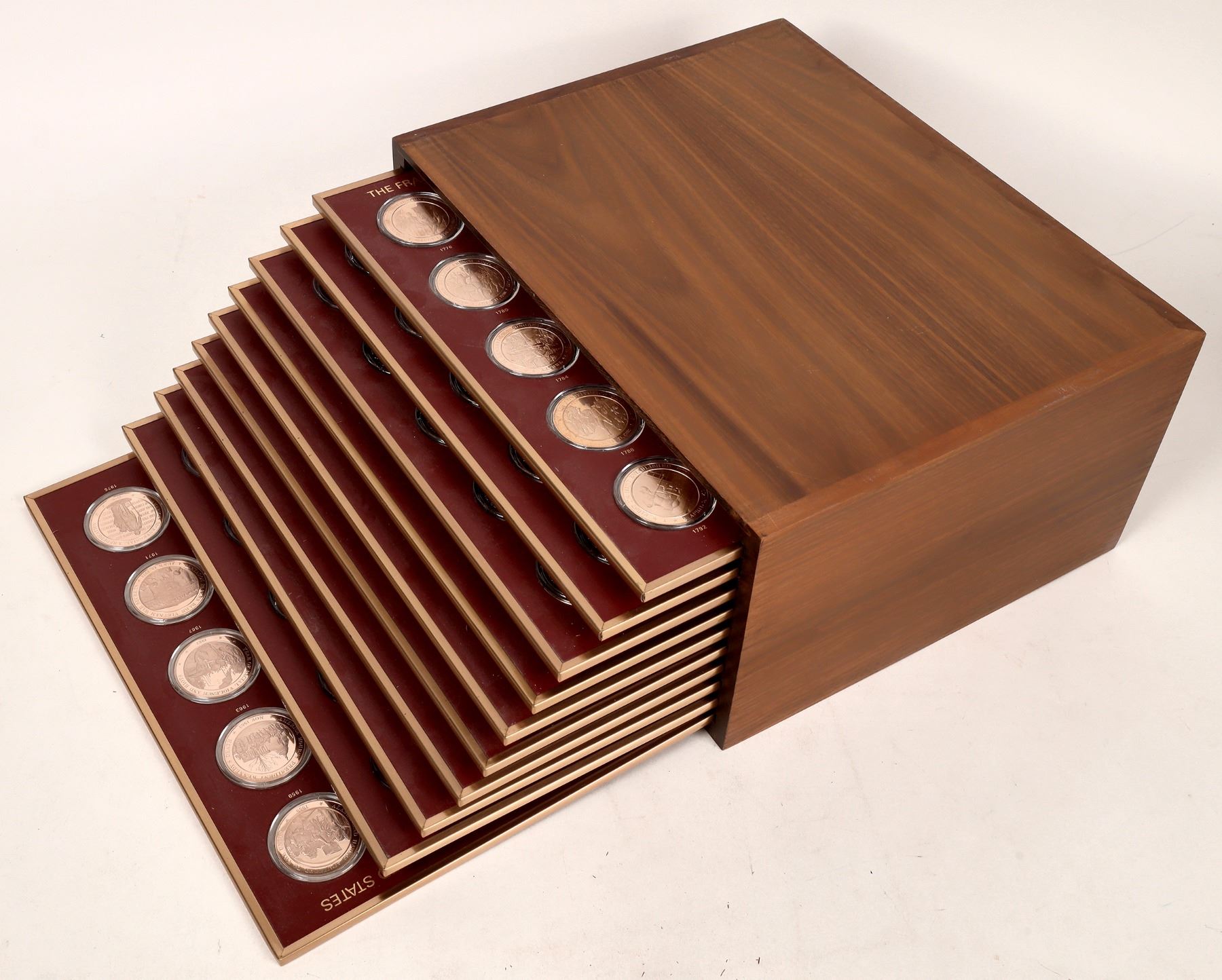 Franklin Mint's History of the United States in 210 Franklin Bronze Medals. 45mm.Proof. Medals issued, 1966-1977 Provides comprehensive history of the U. S. since the Declaration of Independence in 1776. Each medal recalls a different year by depicting the 'event of the year', selected by those listed on its reverse. Collection stored in Walnut Box, 15"w x 12"d x 6-1/4"h accommodating 11 sliding trays holding 25 medals each. Collection also comes with a box of descriptive folders and other significant events of the year for each medal. There is also a HB book included, with the same information.