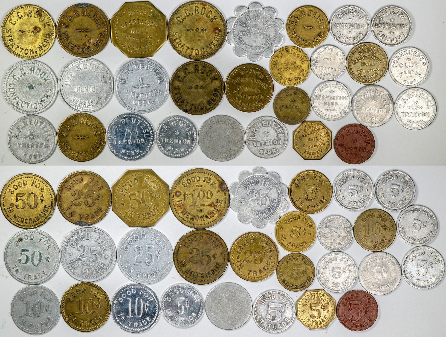 Lot of 29 tokens: Palisade (3):Blue Moon Supper Club; Palisade Recreation Club (2). Straton (12): A. Cowman & Son (R7); C. B. Diehl; Stratton Recreation Club; David's Recreation Hall (5, 10, 25 & 50c); C. C. Rook ( 5, 25, 50, 50c & $1).