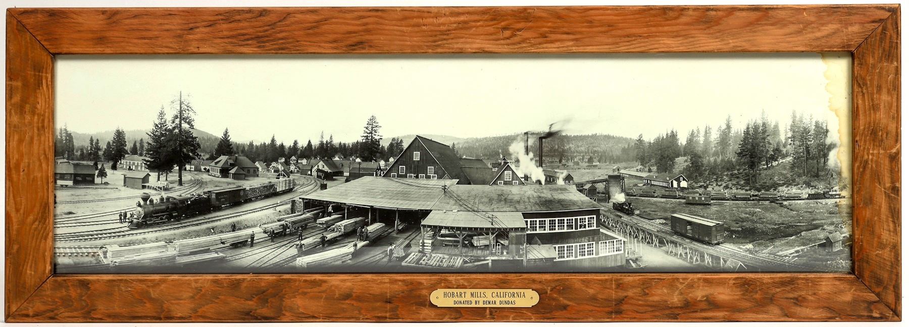 Framed (37 x 13 inches) panoramic black and white photograph of the lumber mill and railroad years of Hobart Mills. Brass label reads: "Hobart Mills, California/ Donated by Demar Dundas".