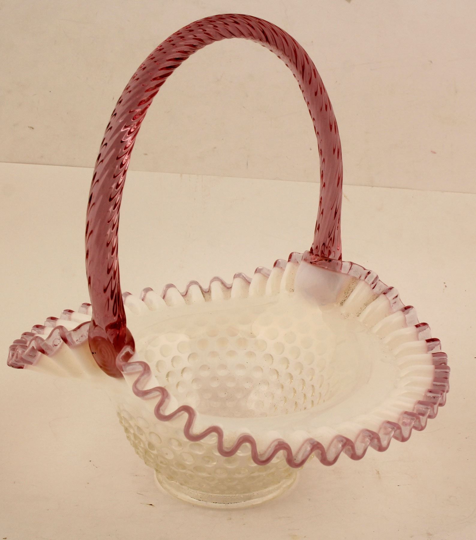 Very beautiful , opalescent moonstone , hobnail basket with applied handle. The body of the basket is covered in hobnail pattern. Also, as the moon stone colorization, reaches the rim of the basket, there is a surprise !! If you hold the item up to a light, or the sun, you will see a " pumpkin orange colorization". This effect is only shown, on very early pieces. Base marked in an oval" Fenton /9 " The basket handle , and the trimming, is also very nice, and in a pale sun colored amethyst colorization. Very unusual, " Bulls's Eye" pattern, on the applied handle ends !! A quality, early piece of pressed glass , art basket. PERFECT CONDITION. (RH).