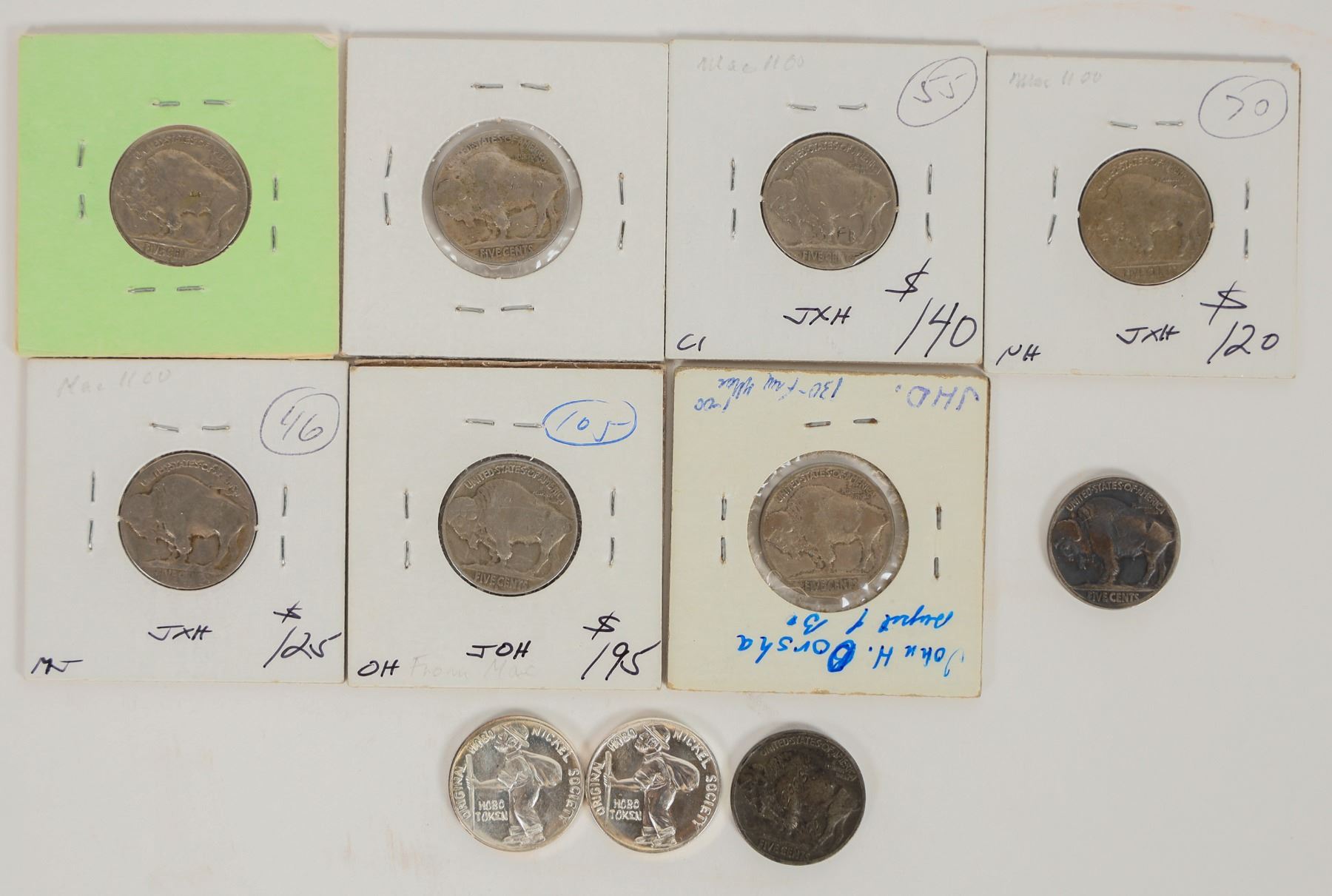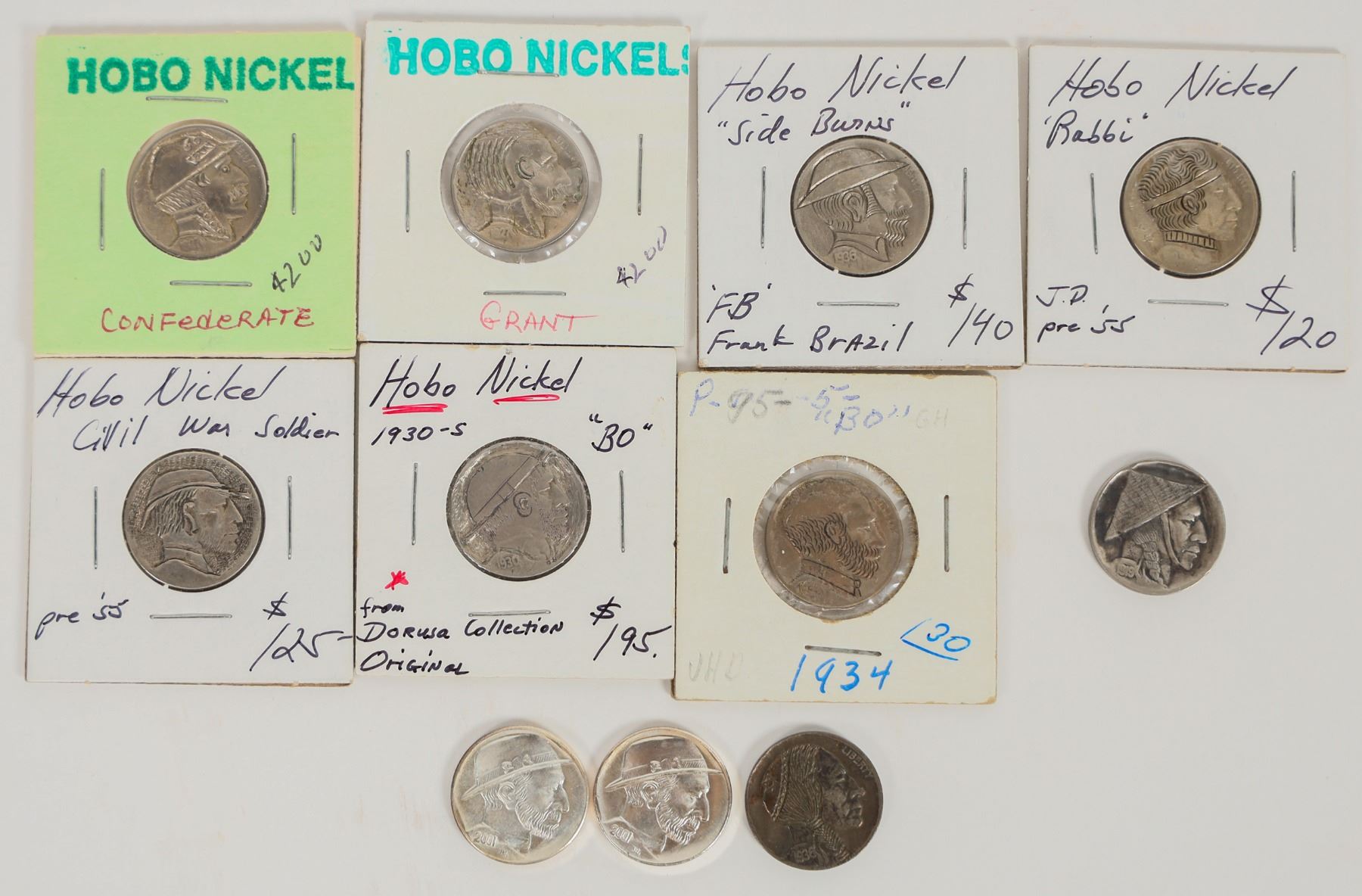 A group of eleven hobo nickels -- Indian-head nickels on which the head of the Indian has been modified to look like someone or something else. Common alterations include different hats, facial hair, and varying hairstyles.