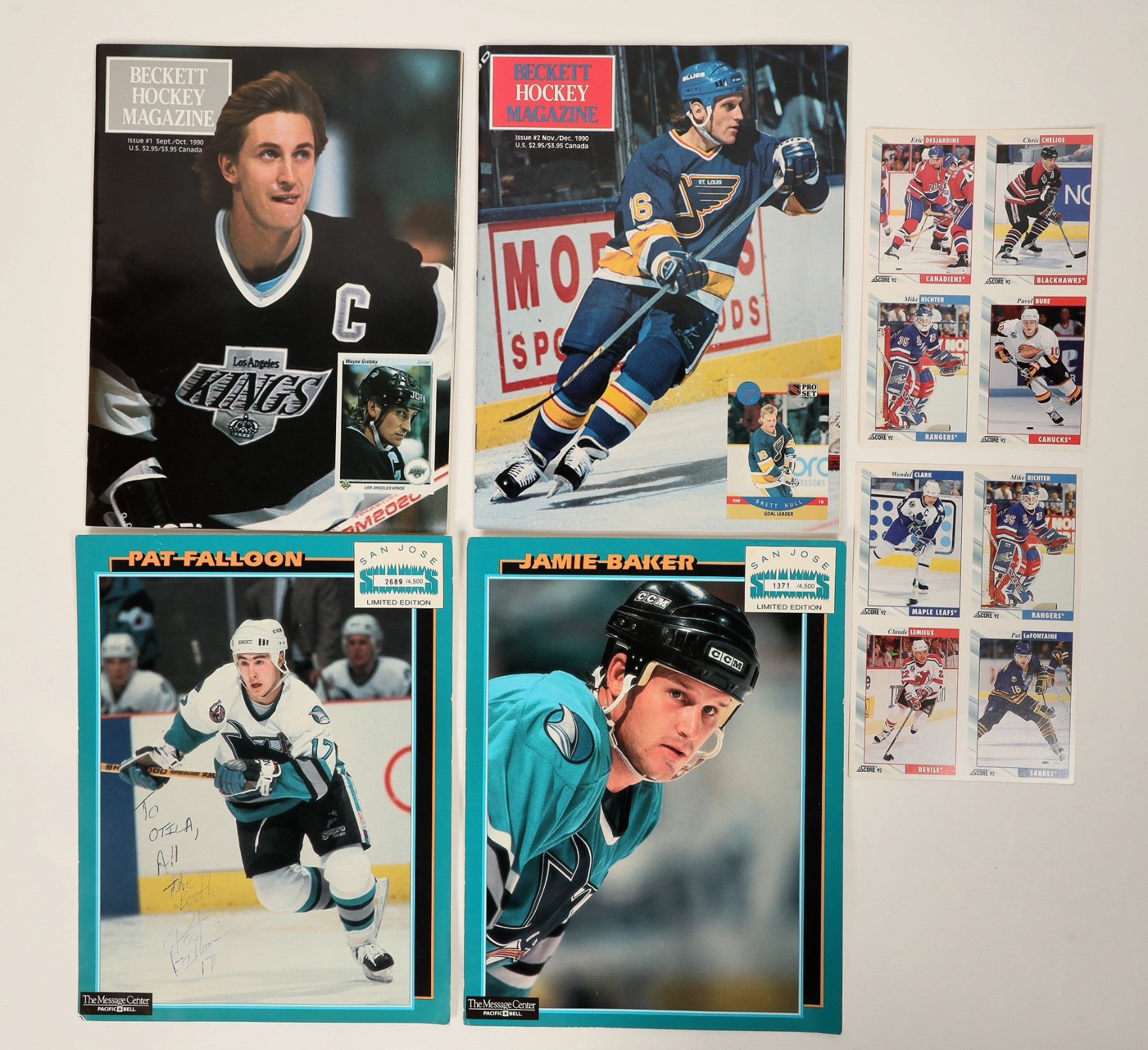 A signed hockey photo by Pat Falloon of the San Jose Sharks, two copies of Beckett Magazine, a couple of player trading cards and a photo of the Shark's Jamie Baker. All in good condition. Please see photos for more details.