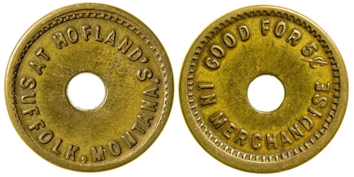 R-8. At Hofland's / Suffolk, Montana // GF / 5c / In Merchandise. Round, brass, center hole, 21mm. (Svoboda Collection) City: Suffolk State: Montana Date: HWAC# 35066