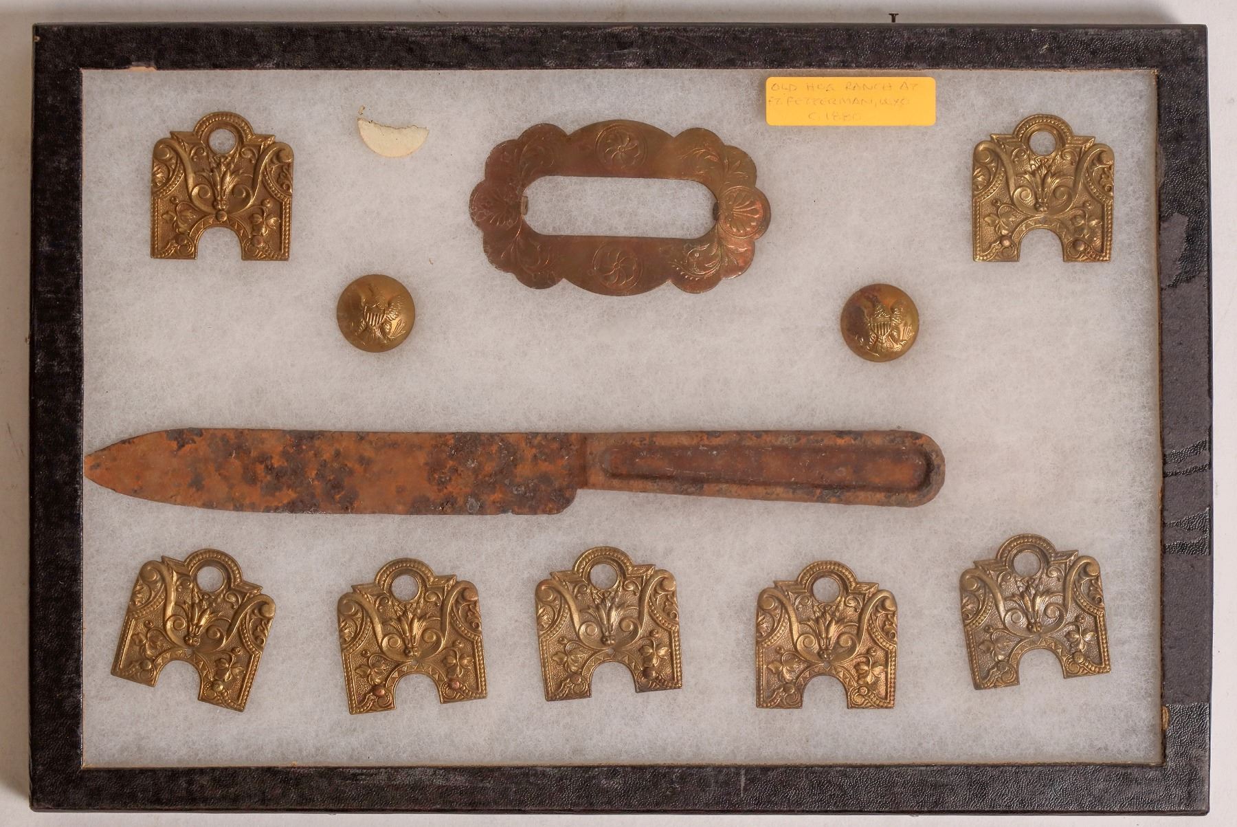 This lot is a collection of metal artifacts from the Hog Ranch at Fort Fetterman, Wyoming. There is a beautifully engraved brass barrette, two large eagle Horstman Bros. buttons at 13/16 in. , a metal kitchen knife, and seven pounded brass fasteners of unknown purpose. The Hog Ranch was on the north side of the Platte River while the Fort itself was on the south side of the river to at least slow the egress of soldiers to the closest whore house. The Fort was later abandoned by the army in 1882.