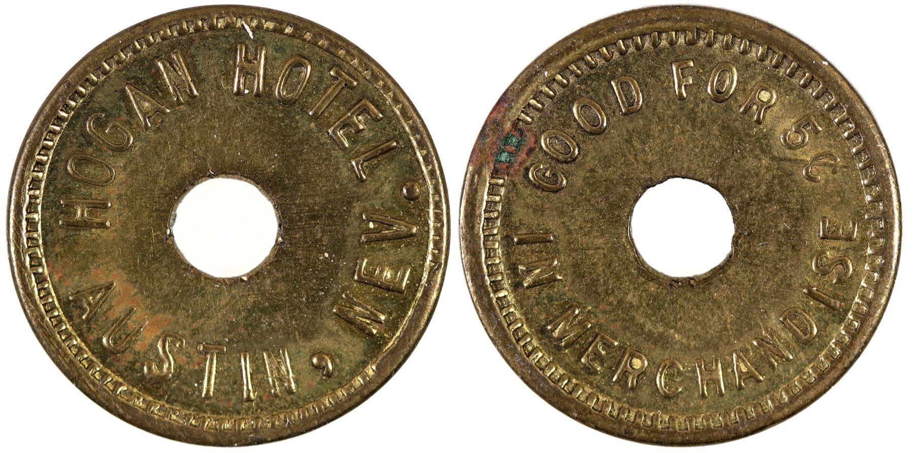 HOGAN HOTEL / AUSTIN, NEV. // GOOD FOR 5¢ / IN MERCHANDISE (center hole); Br., rd., 21 mm. City:Austin State:Nevada Date: