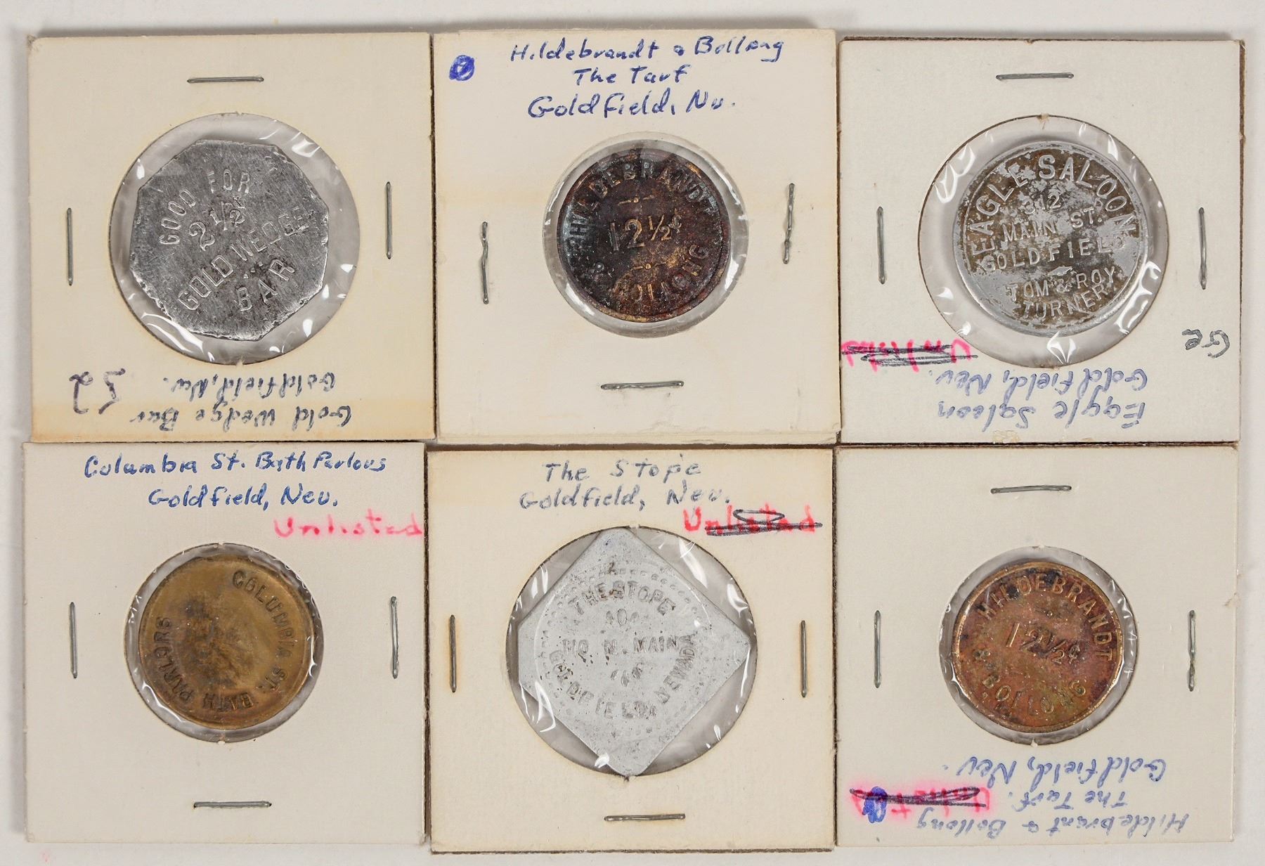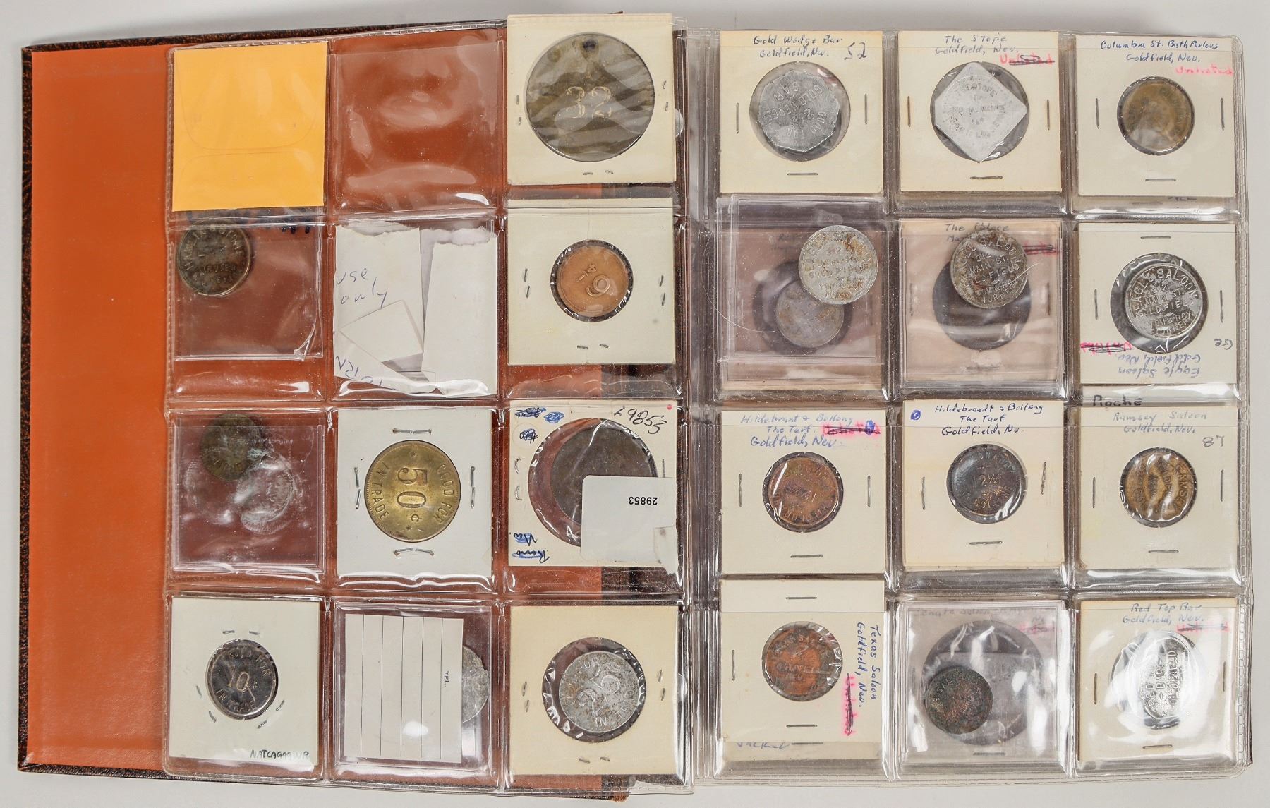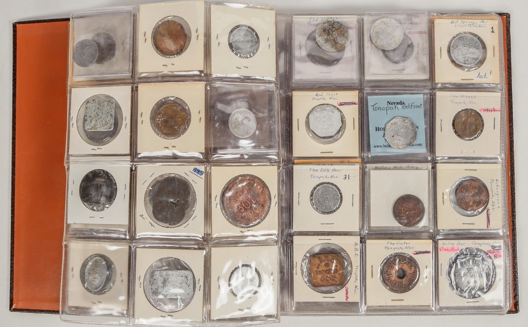 Reference collection of fantasy and fake Nevada tokens accumulated by FH over the years. 74 pieces in a Dansco album.