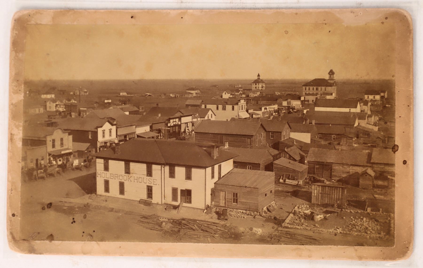c. 1880-83 photo of Holbrook, AZ. Holbrook House in foreground, also New Drug Store. Holbrook burned down in 1888. 4.5x7.75". Some discoloration, please inspect. Holbrook Arizona