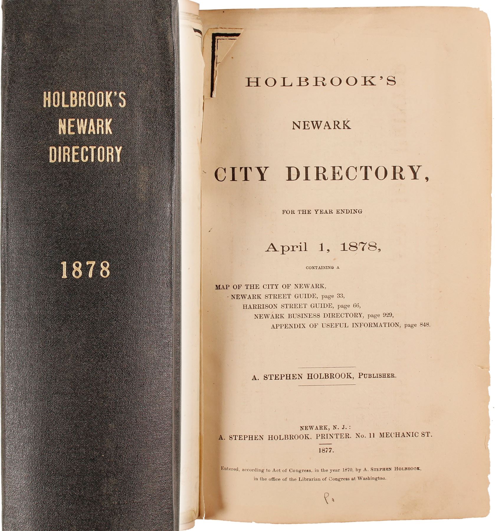 Holbrook’s Newark City Directory for the Year ending April 1, 1878, published by A. Stephen Holbrook, 1877. New binding, 1108 pages, plus folding map. State: New Jersey City: Newark Date: 1878