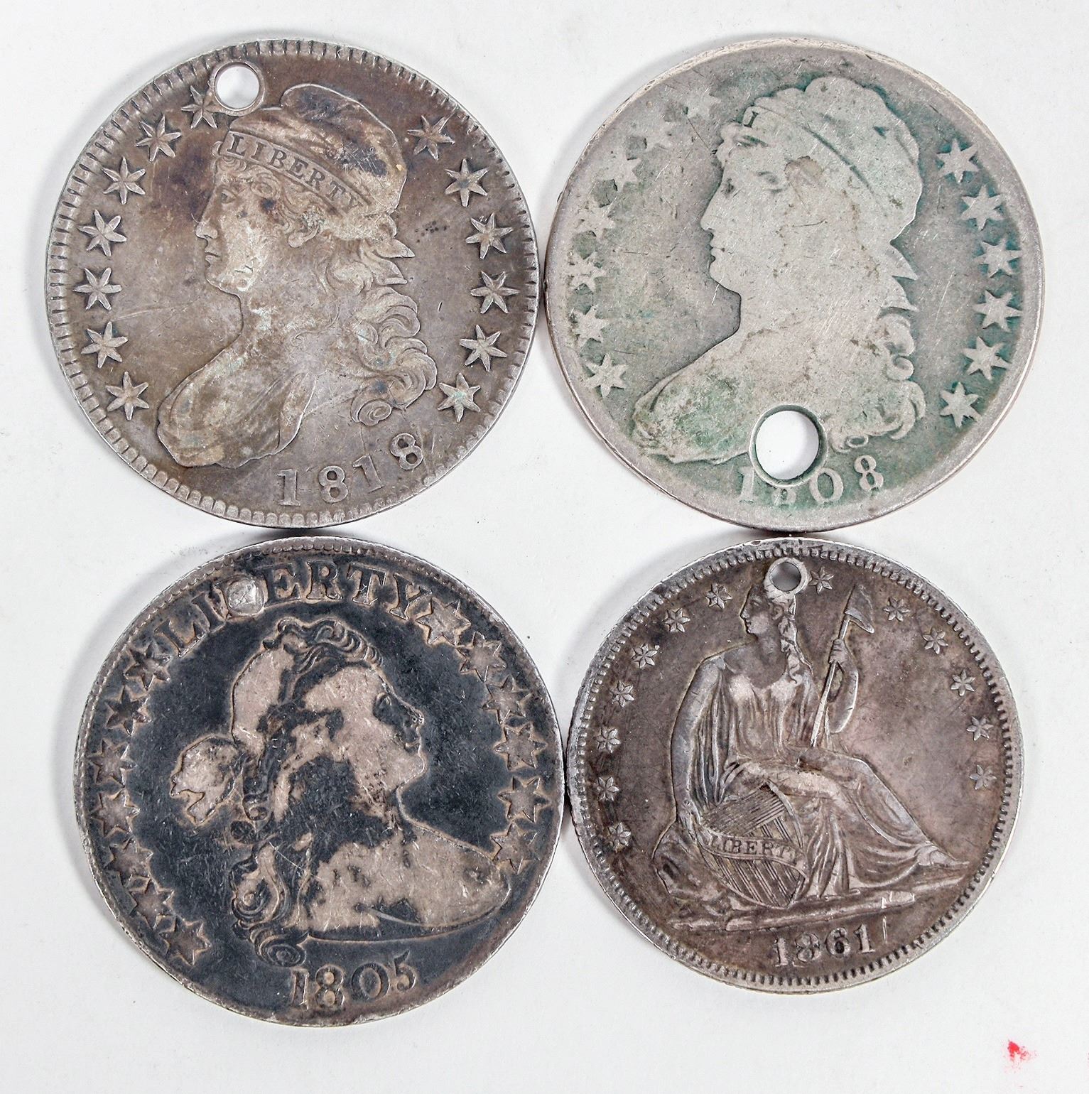 Four U. S. half dollars: 1) 1805 Draped Bust, poor to fair condition, holed and plugged; 2) 1808 Bust half dollar, AG-G condition, holed; 3) 1818 Bust half, VG-F condition, holed at top; 4) 1861-O Liberty Seated half dollar, F-VF condition, holed at top.