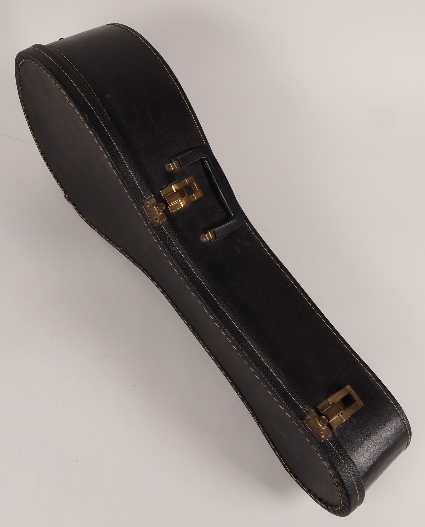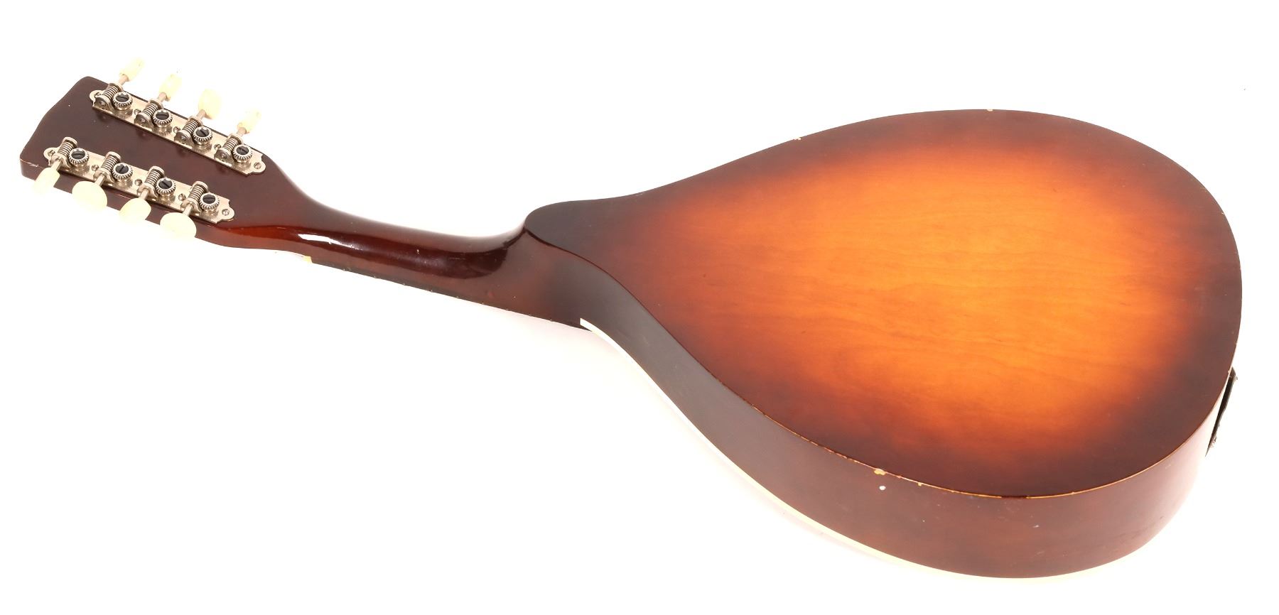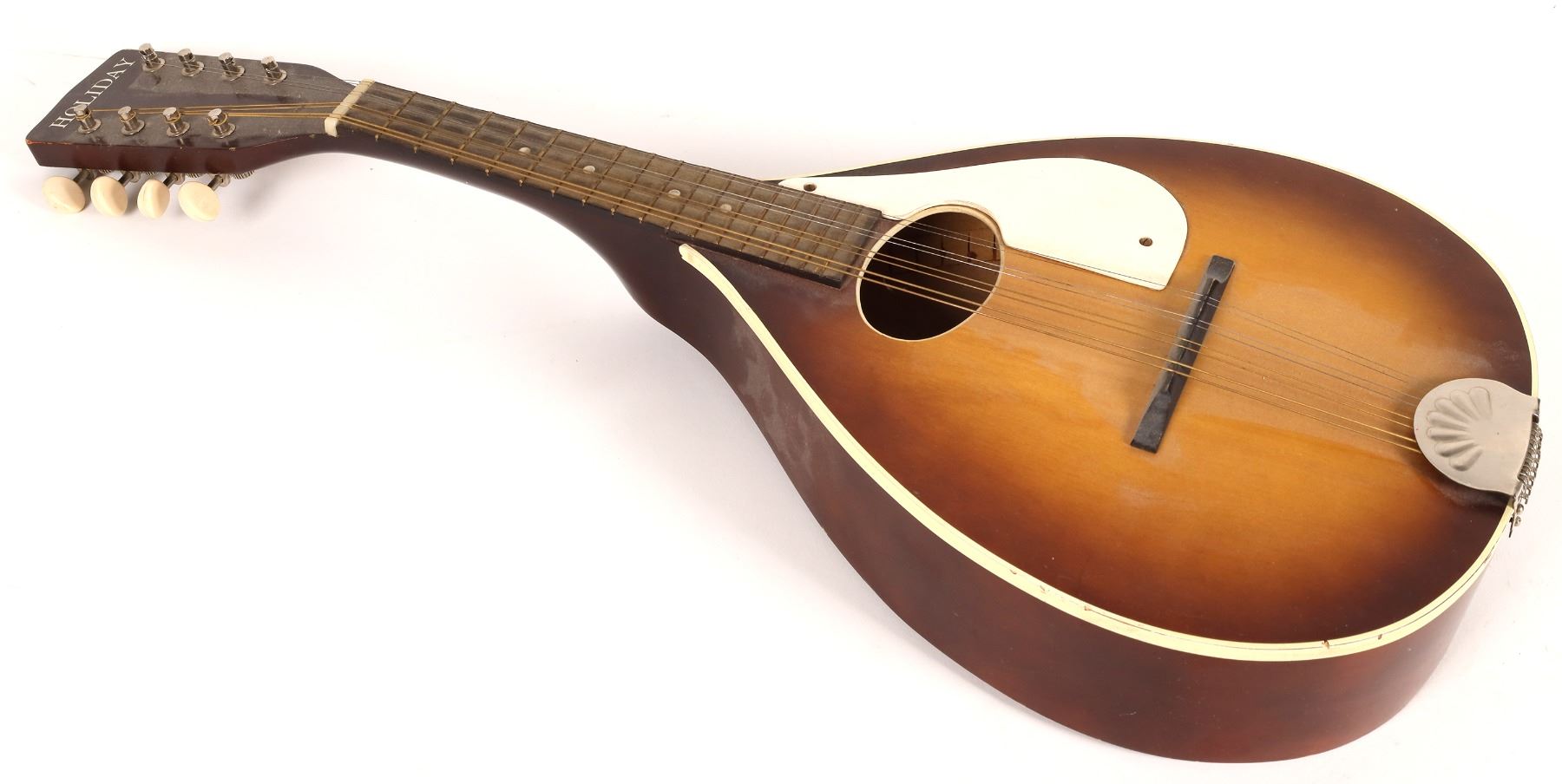 This Holiday mandolin is 24 in. with a spruce top S/N H331 in a starburst pattern. Tuners are all firm. Only lightly used with light handling nicks. Has a scalloped tailpiece and a hard case.