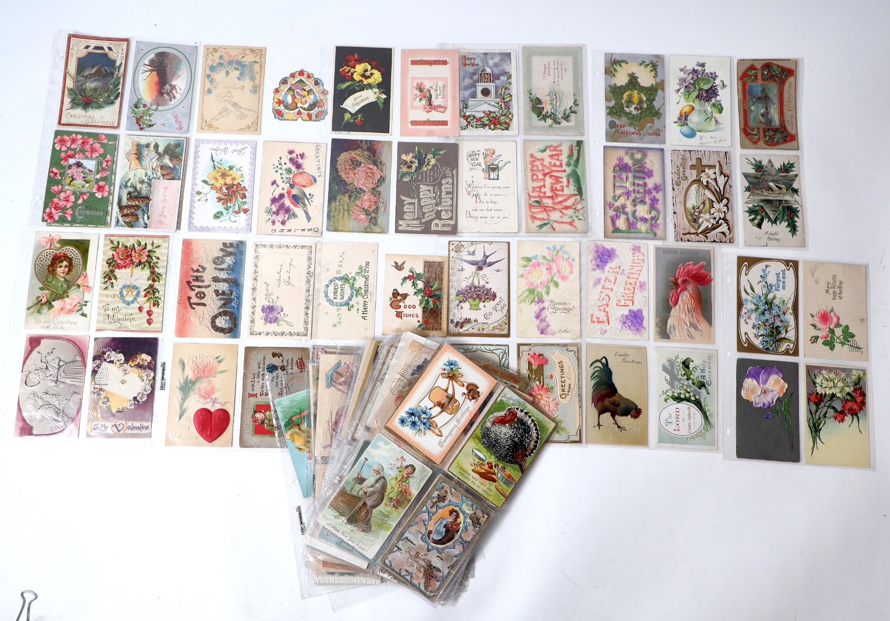 Lot of 168 postcards in 42 plastic sleeves of four per sleeve, 5 only have 3 or 2 cards. There are leather cards also. All are in very good condition , postmarks (mostly Calif)) . Some embossed.