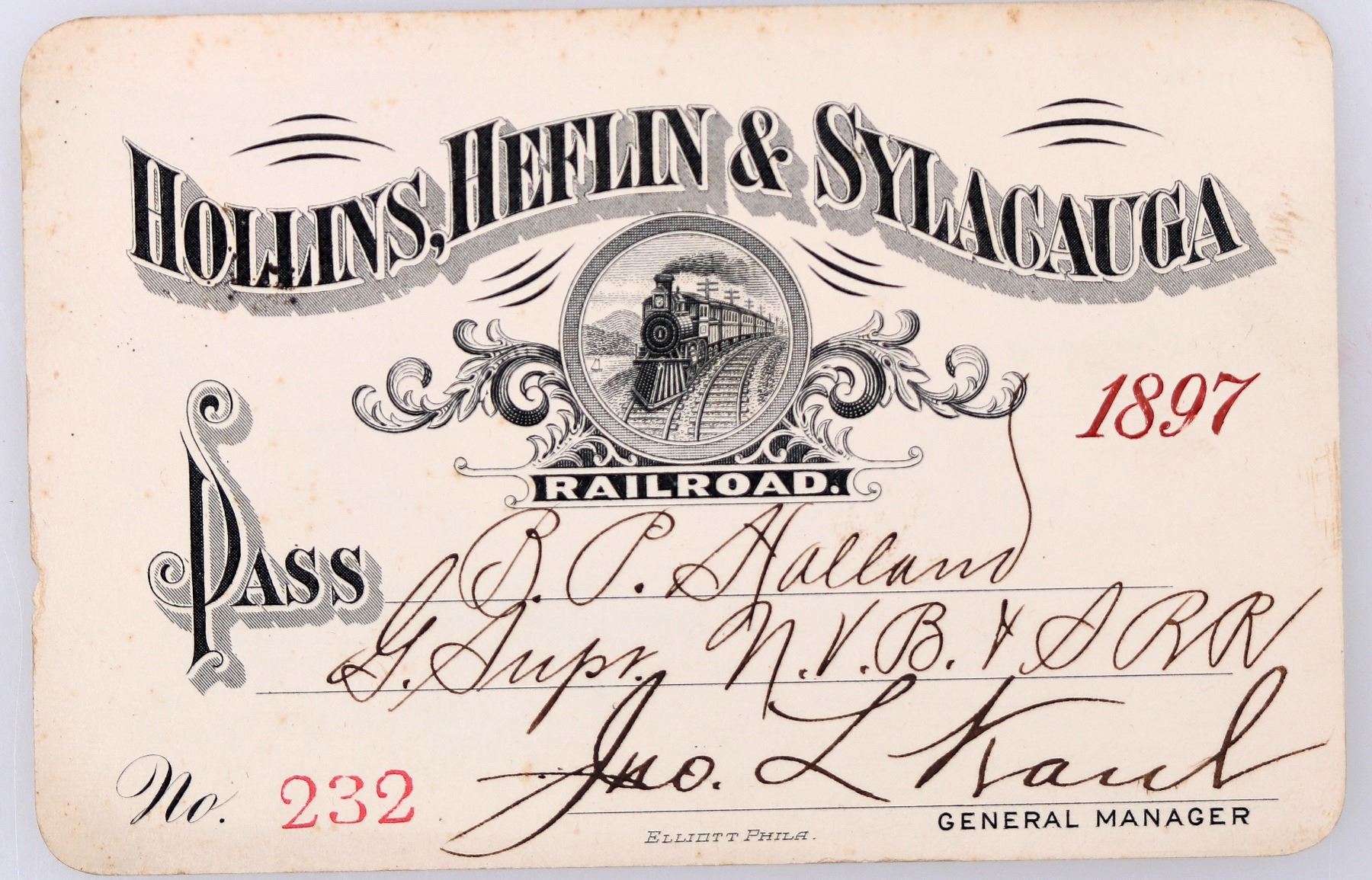Pass no. 232, issued to BP Halland for the year 1897. Signed by general manager Jno. Kaul(?). Black and red print on cardstock with locomotive vignette. Printed by Elliott, Philadelphia. Logging railroad that operated in Clay County, Alabama from 1895-1902.