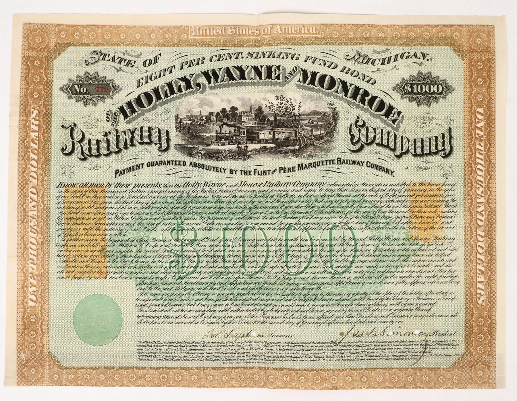 $1000 eight per cent sinking fund bond issued by the Holly, Wayne and Monroe Railway Company. Brown and green ink, railroad and township vignette; imprinted revenue stamp.