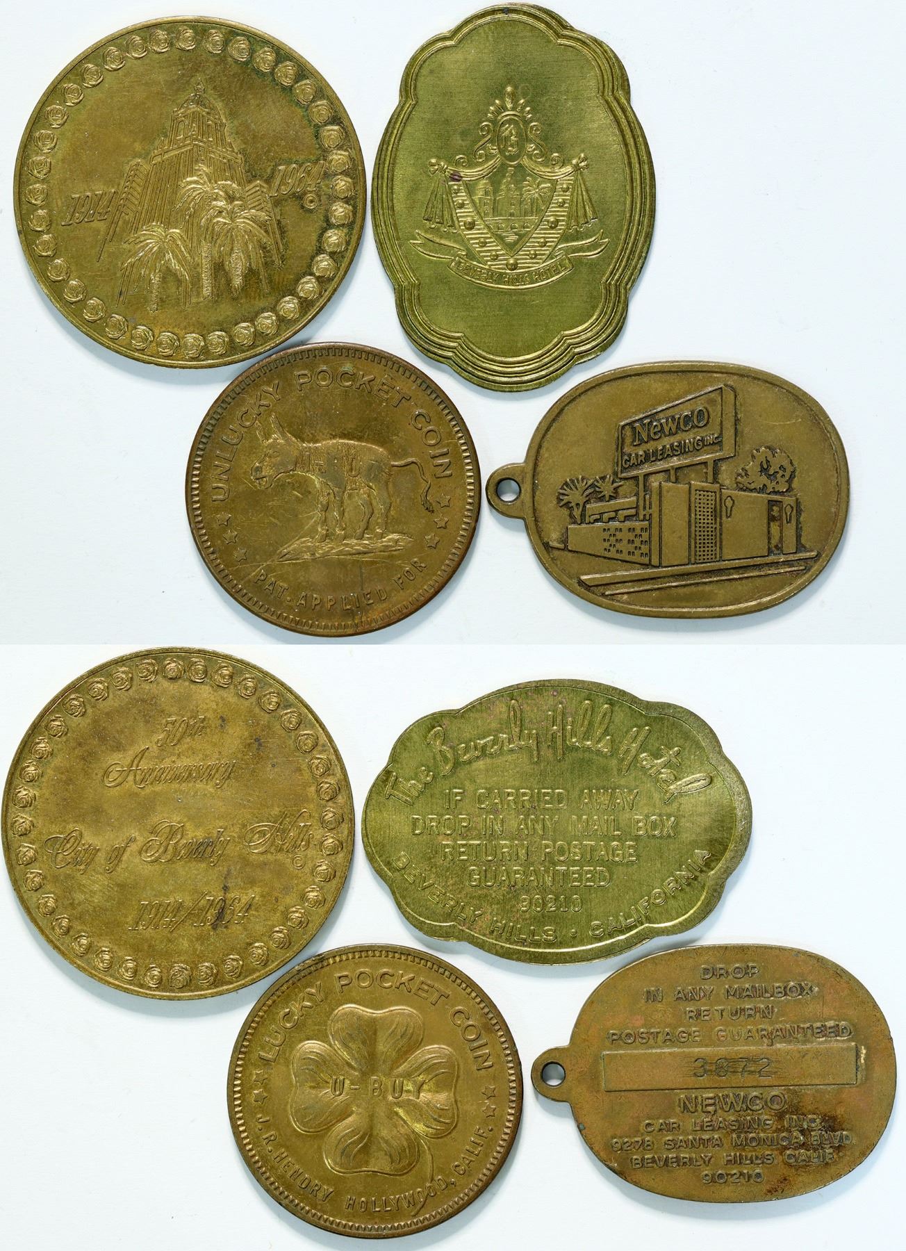Lot of four: Beverly Hills Hotel; 1964 50th Anniversary of the City of Beverly Hills; Newco Car Leasing of Beverly Hills; J. R. Hendry Lucky Pocket Coin, Hollywood.