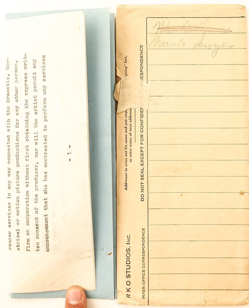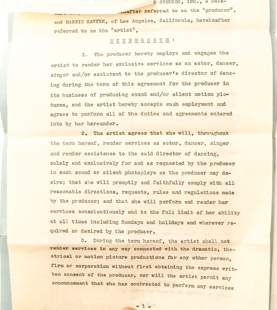 Hollywood contract from RKO Studios stating the producer is hiring Marnie Sawyer as an exclusive employee--actor, dancer, singer and/or assistant to the the producer's director of dancing. She was in the ensemble of the 1928 stage production of New Moon among other things. Date: 1930 Location: Hollywood, California HWAC # 44122