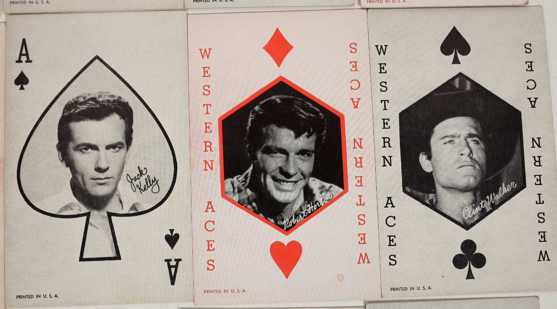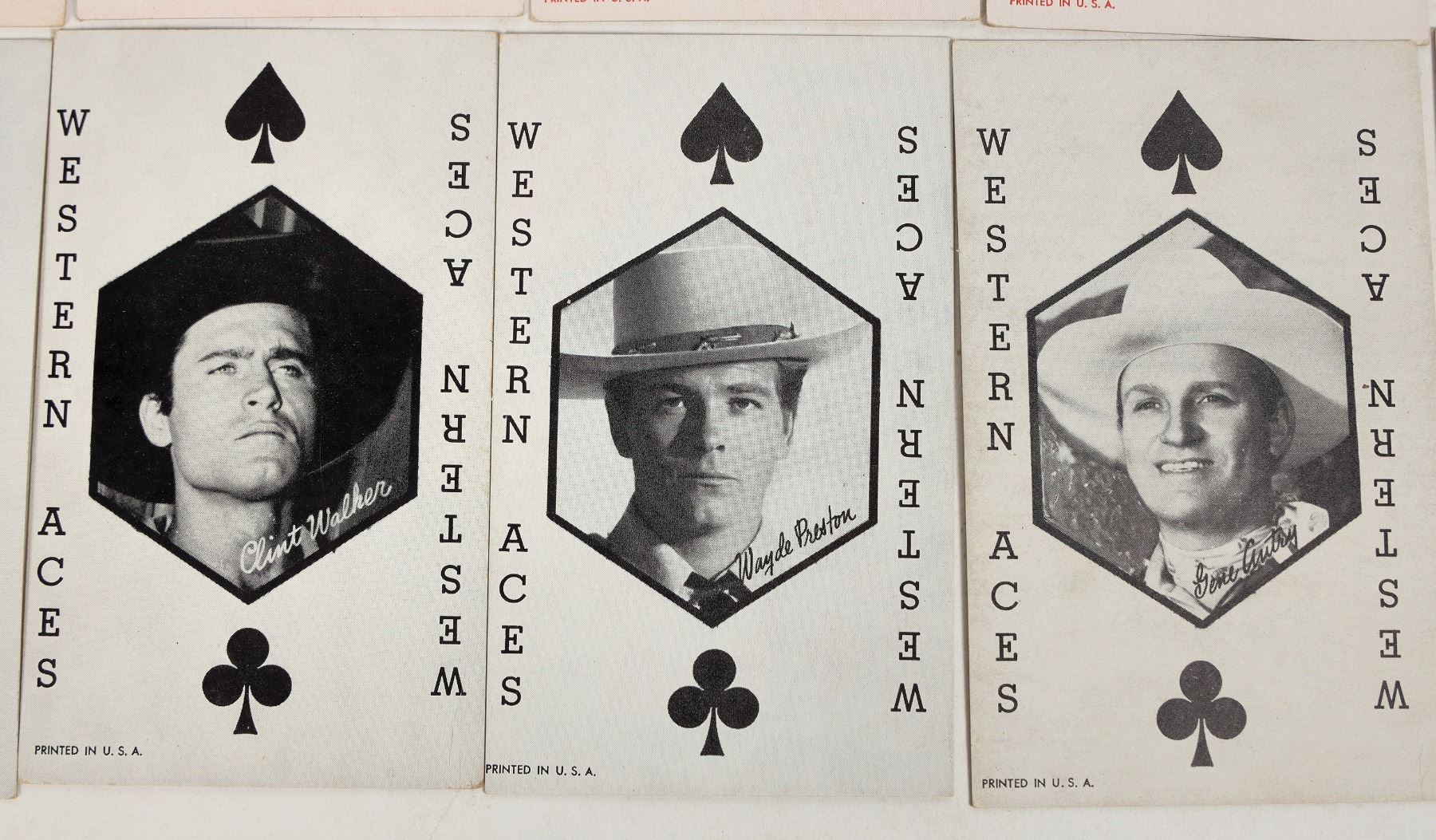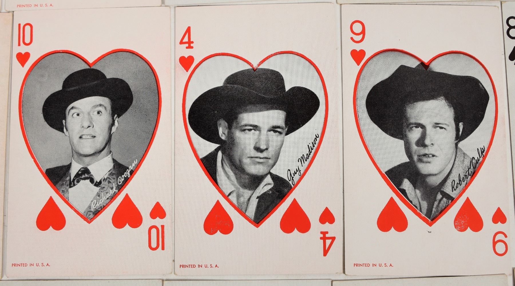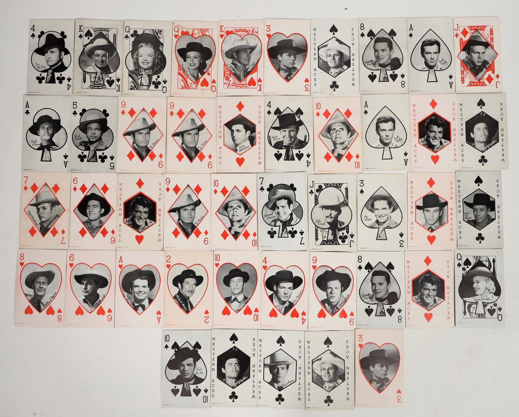 Group of 45. Some duplication. Cards printed with cowboy and cowgirl photos and made to look like playing cards. No info on the reverse or printer listed. Actors include Roy Rogers, Tim McCoy, Noreen Nash, Gene Autry, Ty Hardin, Clint Walker, and more. 5.25 x 3"