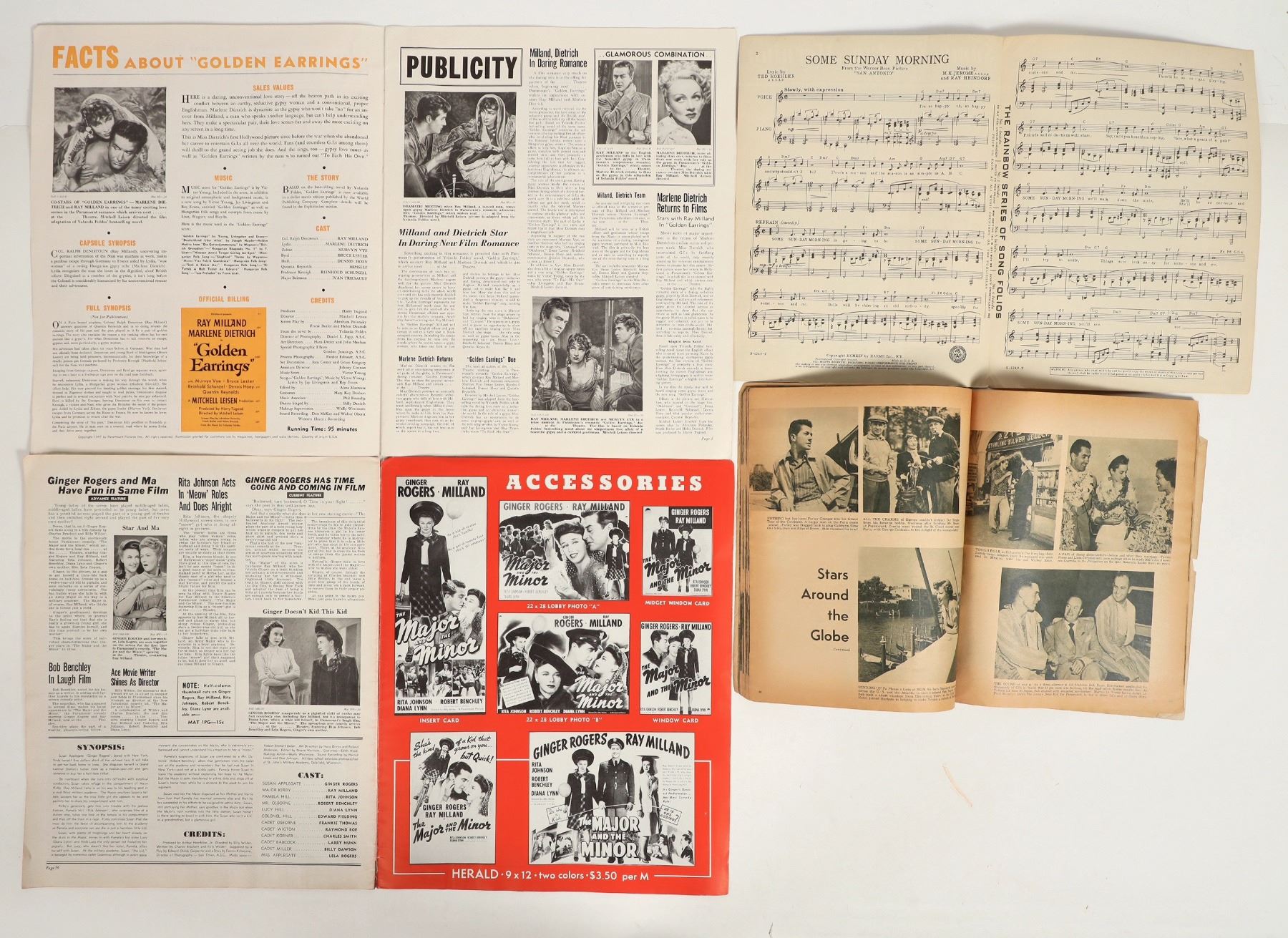 Lot of 4. 1) Press book for "Golden Earrings" (1947). 20pp. 30 illustrations of sample poster and newspaper ads. 2) Press book for "The Major and the Minor" (1942). 28pp. 3) "Movie Life Yearbook" (1951), 98pp. issue. Cover photo of Elizabeth Taylor. 4) 4pp. of sheet music for "Some Sunday Morning" from "San Antonio" (1945).
