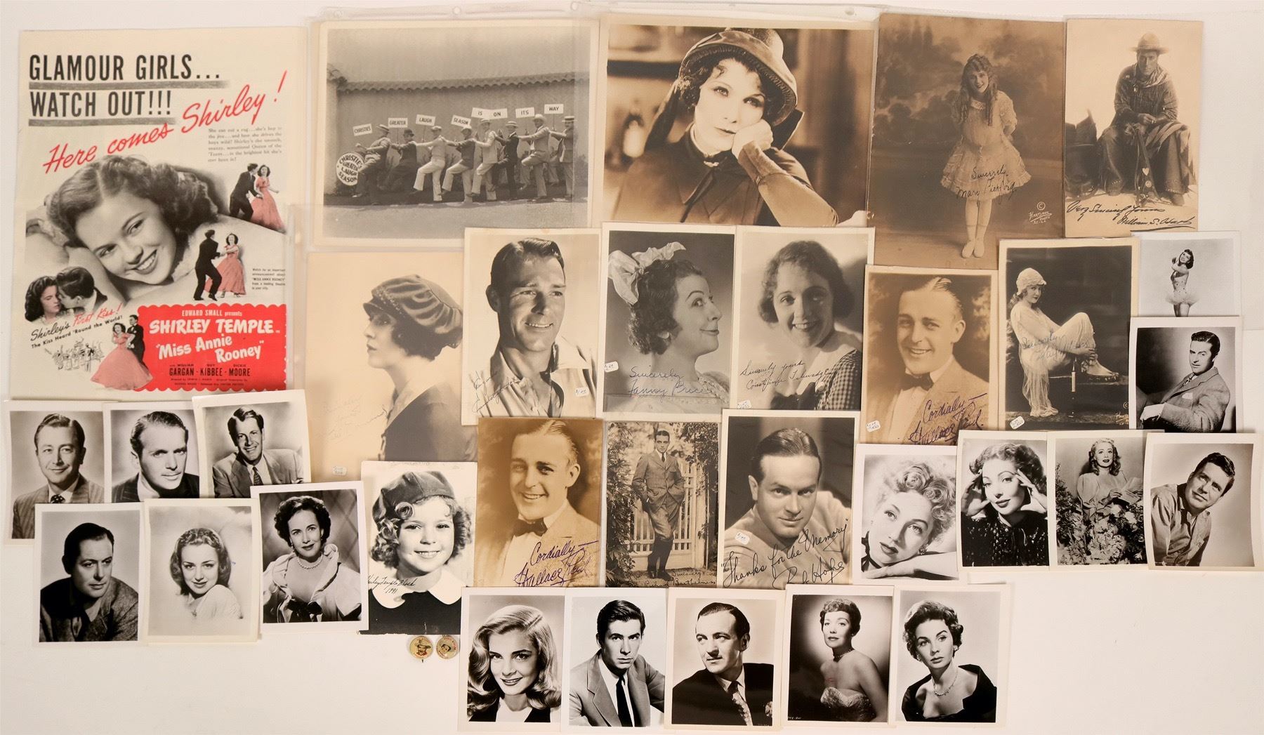 Lot of 30+. 1) Two Quaker Puffed Rice pinbacks featuring early film stars: Dennis Morgan and Ray Milland. 2) Seventeen 4 x 5" vintage prints of movie stars, all identified on the reverse. 3) Twelve assorted vintage prints with pre-printed signatures. 4) Advertisement for Shirley Temple in "Miss Annie Rooney," plus postcard of Temple with autograph dated 1991.