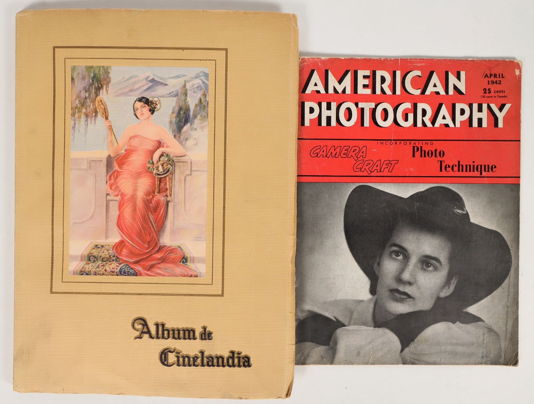 "Album de Cinelandia" by Lucio A. Villegas, a collection of biographies and portraits published in Hollywood, 1928 (printed in Spanish language). Includes an American Photography magazine published in NY, 1942. The paper-back covers of both works are noticeably worn, but remain sturdy. The binding on the magazine is heavily worn, with the spine of the cover only 30% intact. Photo book measures about 10x14", magazine measures 8.5x11.5". See photo.