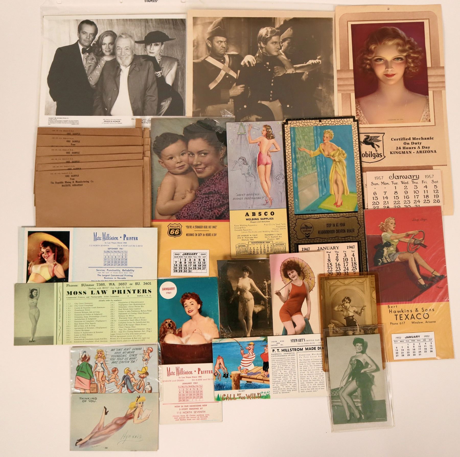 A collection of about 12 photos, one with Robert Donat Count of Monte Cristo in a scene from the 1934 film of the same name, nice original. 1985 photo of Jack Nicholson, Kathleen Turner and Angelica Huston star in a film by John Huston "Prizzzi's Honor., good condition. Pinup gals includes advertisements from Absco, Chevron Hawkins & Sons, Marc htos Wilkinson Printer, Mobilelgas, and Phillips 66. Photos 1906-1939.