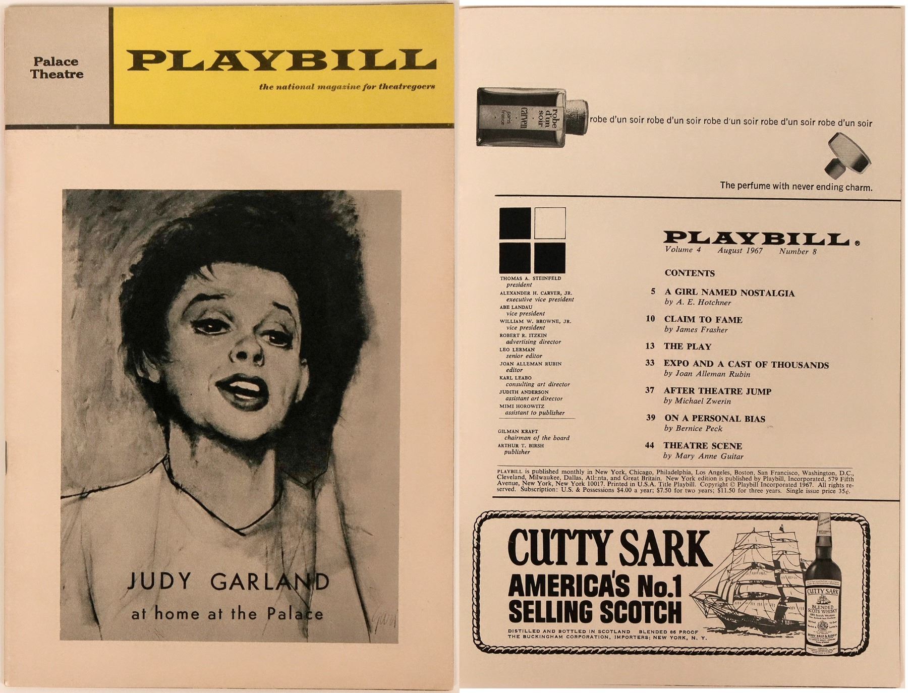Playbill, Palace Theater cover featuring Judy Garland. The Playbill contents include "A Girl Named Nostalgia by A.E. Hotchner; Claim to Fame by James Frasher; The Play; Expo and a cast of Thousands by Joan Alleman Rubin plus