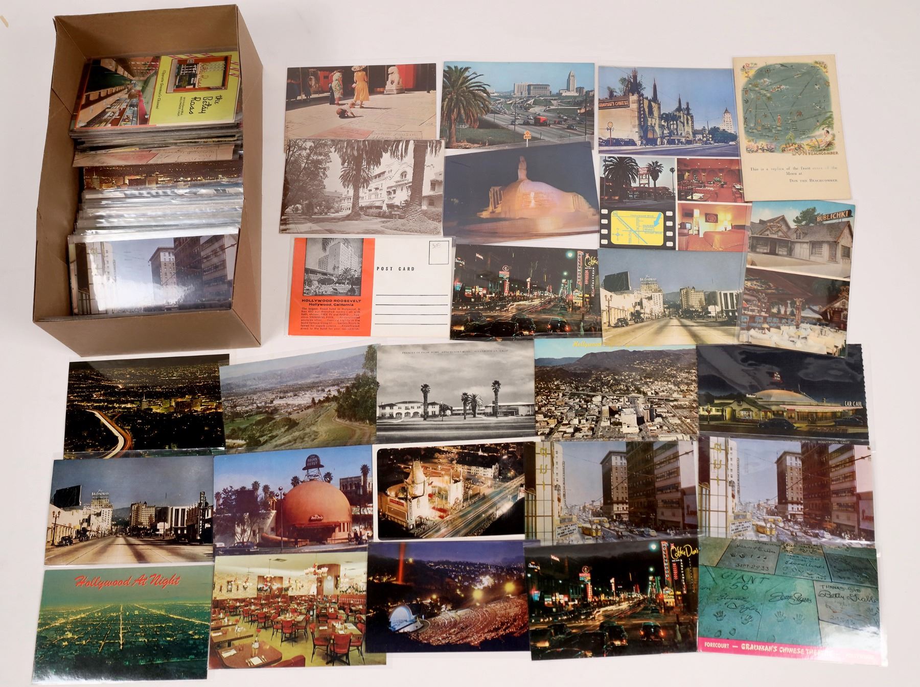 Group of approximately 250 postcards from Hollywood. These postcards are mostly modern chrome style postcards. They depict various street scenes and locations throughout Hollywood including the Hollywood Bowl Grauman's Chinese Theater, the Brown Derby Restaurant, the Carthay Circle Theater, the Beverly Hilton, etc. Some have correspondence written on the backside. 5.5 x 3.5, sleeved, good condition, some are duplicates.