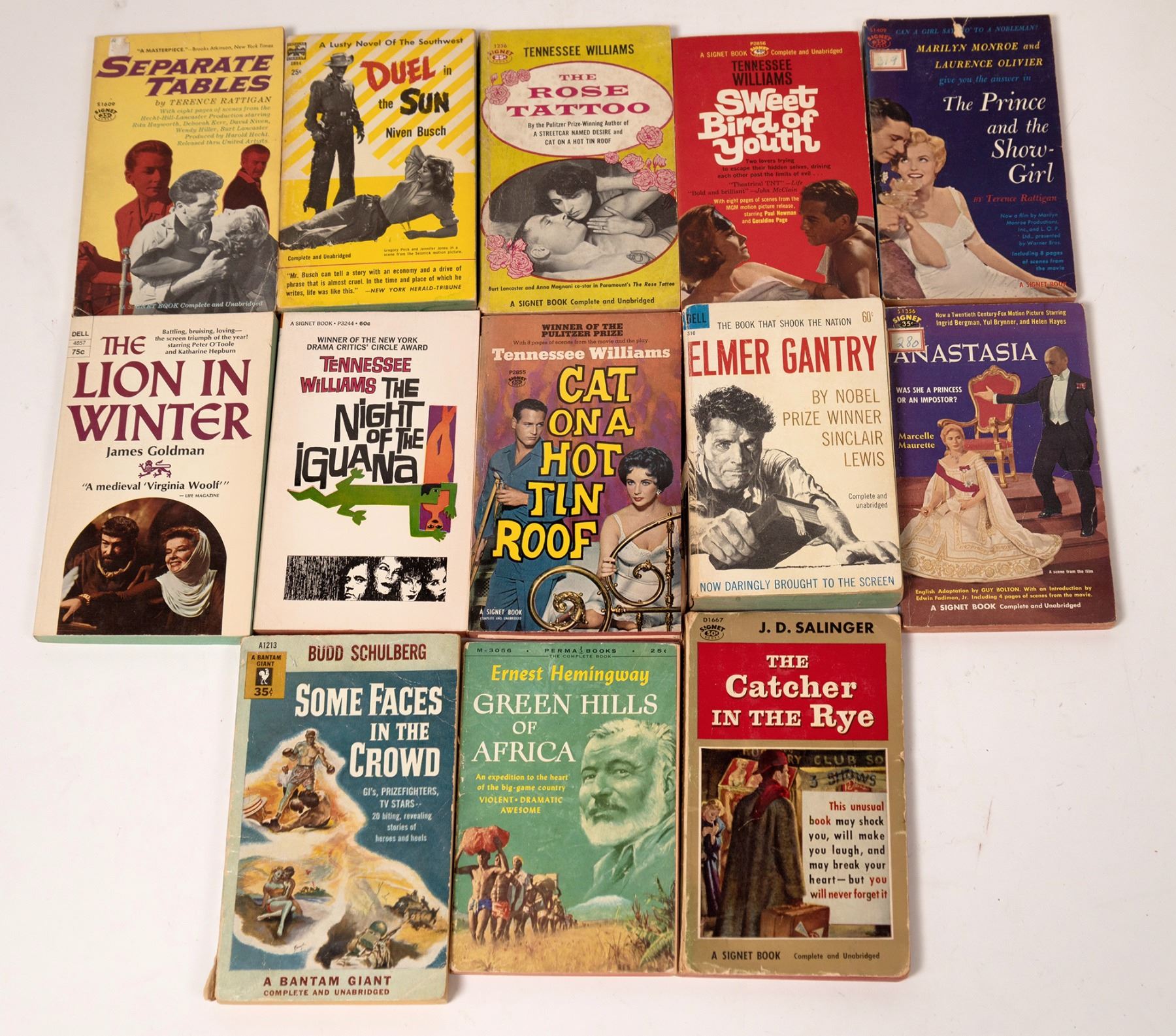 13 c. 1950's-1960's softcover novels with movie tie ins, many of which relate to Oscar winning performances. Marilyn Monroe, Lawrence Olivier, Richard Burton, Elizabeth Taylor, Paul Newman, Gregory Peck etc. Catcher In The Rye. Nice covers!
